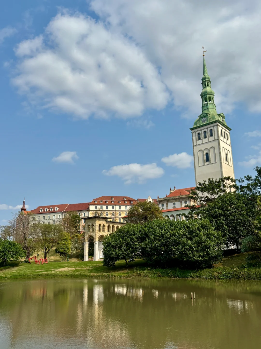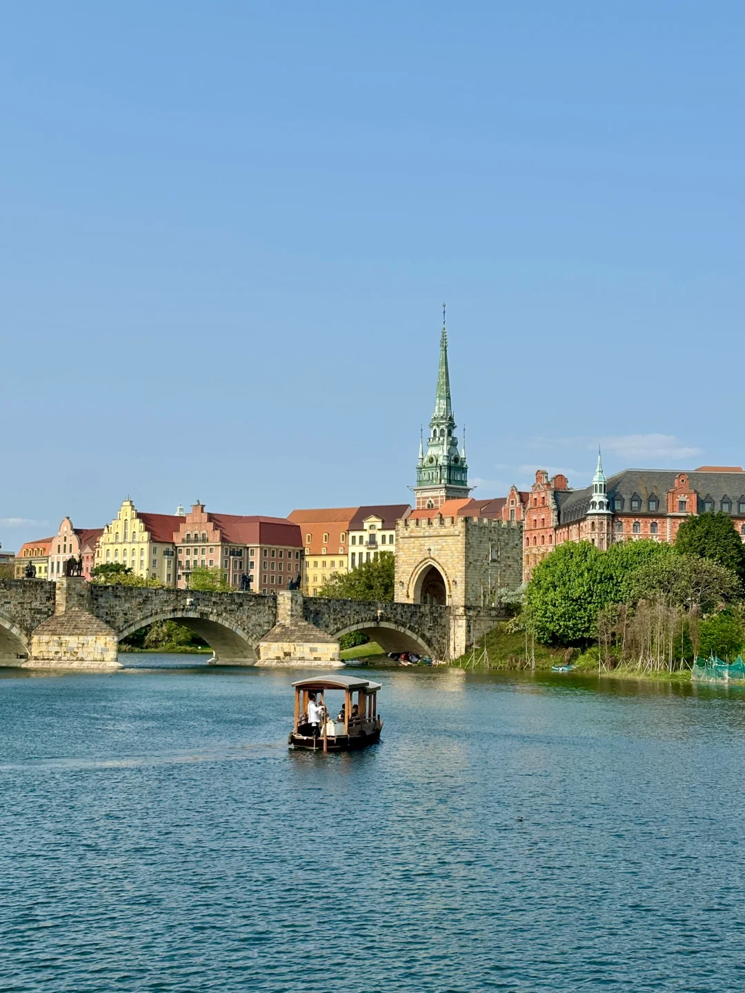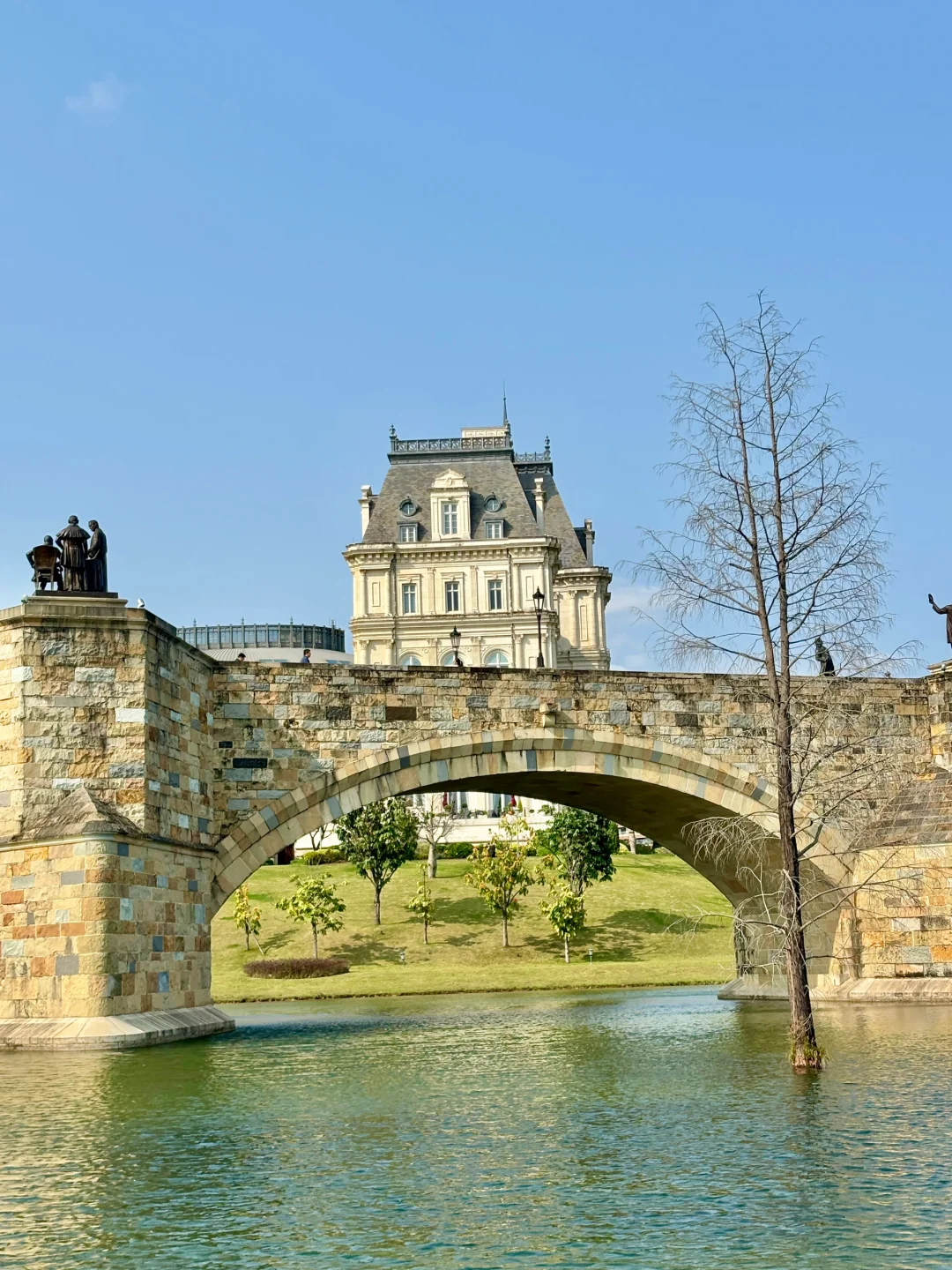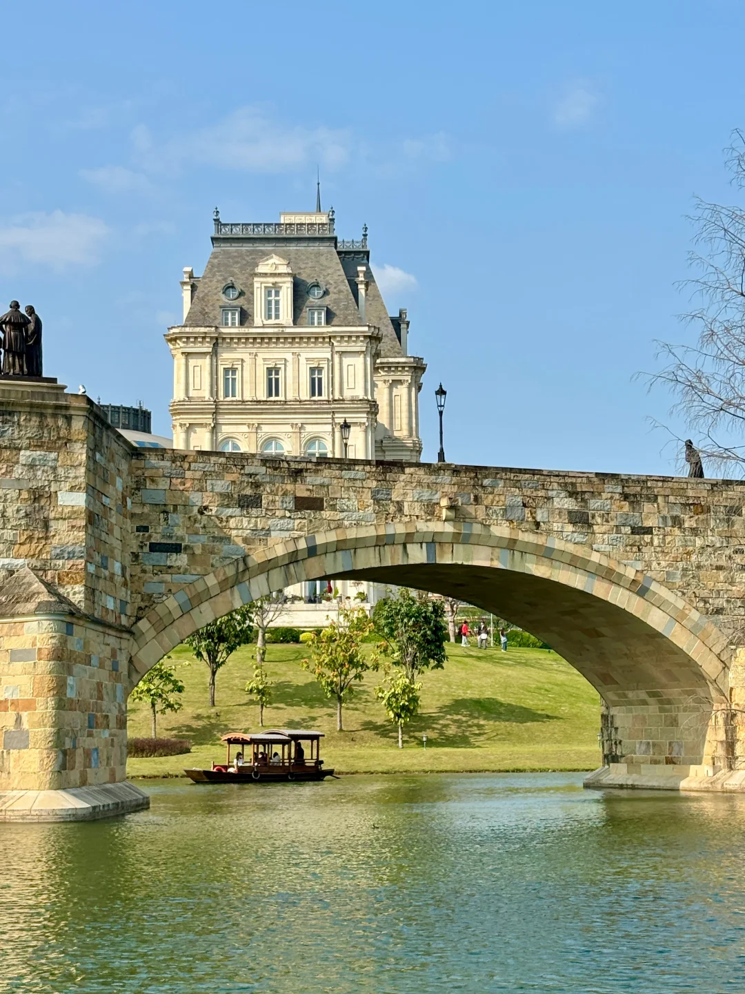 从大学路进入,骑行5分钟可到,也是松山湖Z精华的部分,城堡和查理大桥,碧绿的草地,初春的樱花,游船以及波光粼粼的湖水,仿佛来到了布拉格,拍照📷咔咔出片