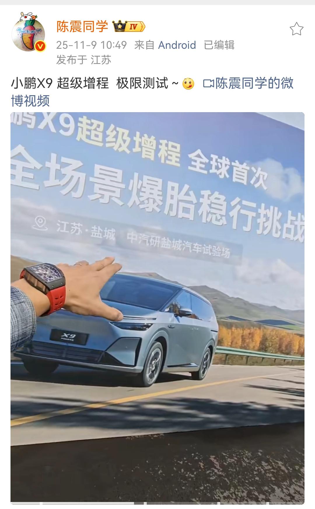 陈震:小鹏X9超级增程极限测试~[狗头] 陈震说关于高速爆胎测试他参与了不少,这确实是第1次参加MPV的爆胎测试,小鹏搞出来的这个全场景爆胎稳行挑战确实比较有意义,特别是对于冬天的北方用户来说比较有意义。 大家也都知道冬天北方道路上可能有冰,如果爆胎都能解决,那么也会解决单轮突然压到冰附着力的问题,防止车辆突然压上冰出现失控。 小鹏X9增程车的推出,对于北方用户来说是一个利好,此前很多北方用户不购买纯电车的就是因为冬季的续航大幅度缩短。 各位是怎么看的?欢迎评论区留言。