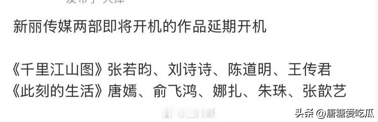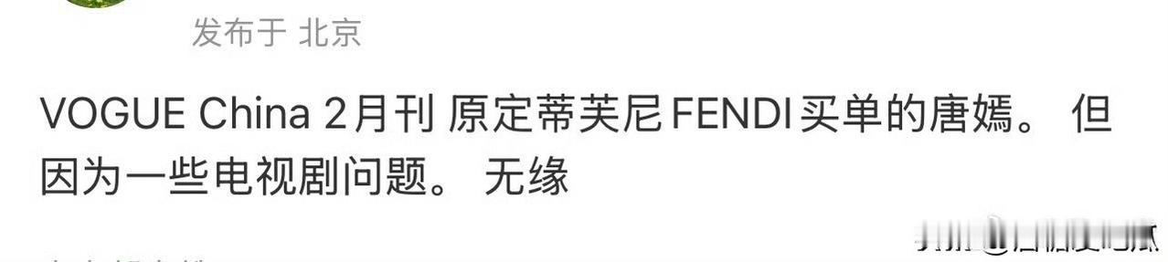 唐嫣这辈子吃过的苦 大概就是王家卫 Vogue 二月刊掉了 蒂芙尼FENDI 因举行问题无缘 央八黄金档电视剧爱神被撤档了 即将开机的《此刻的生活》也延迟开机 新丽另一部剧《千里江山图》也延迟开机了,该剧由张若昀,刘诗诗,陈道明,王传君主演,看到这一堆人,大家心里就明白为什么延期了,都是最近热门人物。