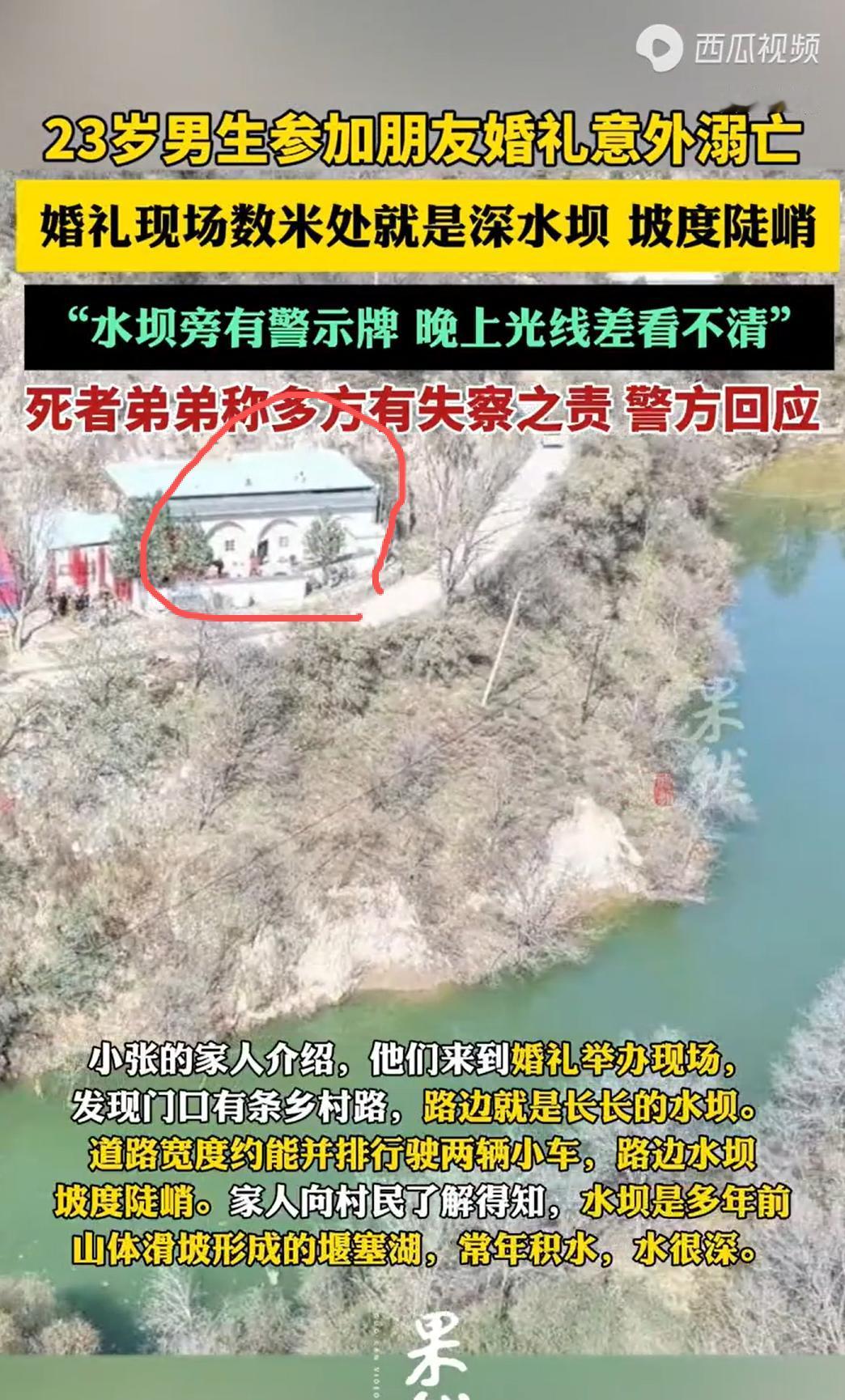 陕西延安,一23岁男子在西安读大学,为了参加好友婚礼,专门请假回老家。夜晚十点,男子在婚宴场地旁的乡村小路边解手。不料,男子脚下不慎一滑,瞬间坠入水坝。尽管公安消防迅速赶到搜救,男子还是不幸离世。事后,家属发现,现场仅有的几块“严禁下河垂钓、游泳”警示牌,危险坝岸竟无任何防护栏。家属找相关单位讨要说法,然而,交通局说路已移交,设计本无护栏;水务局否认归其管理,即便警示牌上印着其名;街道办则让找其他部门。   据悉,张某某是00后,在西安某大学读大四。   2025年10月下旬,张某某收到一位好友的婚礼邀请,婚礼地点在老家,尽管学业繁忙,张某某还是毫不犹豫地请了假,与两名同学结伴回乡。   10月28日早晨,张某某和同学抵达村里,婚礼在村中一处民宅举办,张某某和朋友们帮忙布置场地、接待客人。   傍晚时分,宾客们陆续散去,张某某和几名同学留在现场帮忙收拾。   晚上10点左右,天色已黑,乡村道路没有路灯,张某某有些内急,走到主家门口的乡村路边解小手。   这条路比较窄,路边紧邻一个深水坝,水坝是多年前山体滑坡形成的堰塞湖,常年积水,水深坡陡。   当晚,张某某在路边站立时,不慎脚下一滑,坠入水坝中,由于水流较急,很快被淹没。   一名参加婚宴的村民听到动静后赶来,立即报警求助。   晚上10点10分左右,张某某的家人接到紧急电话,称他掉进水坝,生死未卜。   家人第一时间赶到现场,只见公安、消防和救援人员正组织打捞,村民们也自发加入搜寻。   大约晚上11点多,张某某被打捞上岸,但已不幸离世。   事发后,张某某的家人对现场进行了仔细查看,发现婚礼主家位于村里的一条乡村路旁,门口直接面向水坝,中间仅有一条狭窄的小路分隔。   家属提供的图片显示,路边竖立着多个警示牌,包括“某某防汛责任人公示牌”和“严禁下河垂钓、游泳”等字样。   更气人的是,水坝周围没有任何防护栏或其他安全设施。   家属认为,婚礼主家选择在这样一个临崖临河的地点举办活动,本身就有疏忽;而相关部门如水务局、交通局和街道办,未能安装基本防护设施,也存在失察之责。   目前,警方已介入调查,事故正在处理中。   与此同时,张某某的家属开始追问责任归属,却遭遇了相关单位的推诿,始终无法知道该向谁主张责任。   那么,从法律角度,这件事如何评价呢?   1、事发路段的公共道路与水域的管理部门是否尽到了安全保障义务?   《公路安全保护条例》第四十四条规定,公路管理机构、公路经营企业应当加强公路养护,保证公路经常处于良好技术状态。   《防洪法》第三十六条规定,各级人民政府应当组织有关部门加强对水库、大坝、堤防等防洪工程设施的定期检查和监督管理。   本案中,街道办具体负责道路养护工作,作为事发道路的直接管理人,是法定的安全保障义务人,其义务并非仅限于设置警示牌,而应采取与危险程度相适应的有效防护措施。涉案道路临水、坡陡、水深,危险系数高,仅靠白天才能看清的警示牌远不足以防范风险,设置防护栏是更直接有效的措施。   所以,街道办可能被认定未能尽到充分的安全保障义务,存在明显过错,应承担主要责任。   对于县交通局,其所谓以“按图施工”的理由并不充分,涉案道路设计必须符合安全规范。在设计一条紧邻深水坝的乡村道路时,未将防护栏纳入设计范围,这本身就可能存在设计缺陷。   交通局作为专业建设单位,对此负有责任,即使道路已移交,其设计阶段的过错仍是导致危险存在的源头之一,难以完全免责。   对于县水务局,涉案地点既然设立了带有责任人信息的公示牌,就在向社会公示其对该水域负有一定的管理或监管职责,即使其不是直接管理人,作为专业水务部门,对辖区内危险水域负有安全监管和督促整治的职责,亦可能因此要承担部分责任。   2、婚礼主家作为活动组织者,是否应承担责任? 《民法典》第一千一百九十八条规定,……群众性活动的组织者,未尽到安全保障义务,造成他人损害的,应当承担侵权责任。   本案中,婚礼主家作为本次婚宴的组织者,对受邀宾客的人身安全负有合理的保障义务,其有责任预见在夜晚、宾客可能饮酒的情况下,场地周边的环境风险,选择在危险水域旁办宴,却未设置临时照明、派员提醒或设置简易围挡,属于未能尽到组织者应尽的谨慎注意义务,存在一定过错。   因此,主家需要承担相应的侵权责任。   3、此外,《民法典》第一千一百七十三条规定,被侵权人对同一损害的发生或者扩大有过错的,可以减轻侵权人的责任。   张某某作为一个成年人,应当对在黑暗环境下靠近水边的危险性有基本的认知和判断能力,其选择在危险地点解手的行为,确实对自身安全不够重视,存在疏忽大意的过失,要自行承担部分责任。   对此,您怎么看?