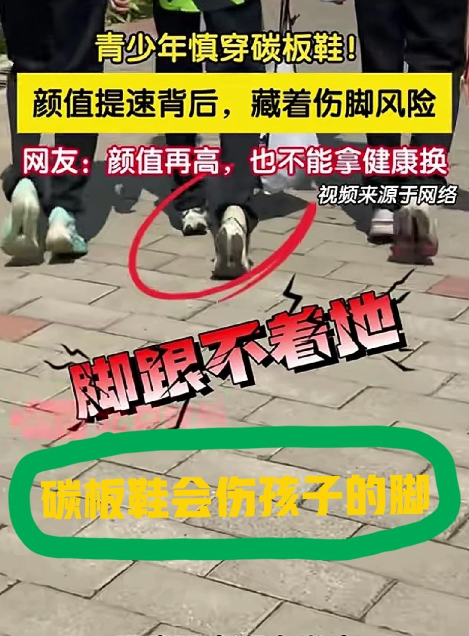 碳板鞋不是日常用鞋,伤了孩子的脚,全怨家长 孩子赶时髦,把跑步专用的碳板鞋当日常用鞋,并长期依赖,结果结果造成孩子脚部骨骼、韧带、足弓的变形或受伤。 一、碳板鞋没有错,应该怨家长,不了解就跟风。 碳板鞋主要是专用的跑步鞋 。在鞋中底部位置嵌入碳纤维板,其设计初衷是为马拉松跑步、田径短跑等特定运动项目服务的 。碳板具有质量轻、强度高、刚性好等特点,能在跑步时为脚掌提供稳定支撑,分散压力 。 碳板鞋的上翘鞋头和高弹性设计,能够助力蹬地推进,将冲击力转化为弹性势能存储并在离地时释放,转化为推进力,帮助运动员提升运动成绩 。 二、碳板鞋不能当日常用鞋来穿。 碳板鞋本身没有错,错就错在,把跑步的鞋当成了日常用鞋。 这3点危害可要记住了: 1、久穿伤害足弓: 硬碳板支撑力强,平足者或足弓塌陷者长期穿,可能加重足底筋膜紧张,引发酸痛。 高足弓者若碳板弧度不匹配,易压迫足弓。 2、给关节带来压力: 碳板的推进力会改变步态,膝盖内扣、脚踝稳定性差的人穿,可能增加膝关节、踝关节负担,长期易引发劳损。 3、肌肉退化: 过度依赖碳板的弹性助推,小腿肌肉、足底肌肉可能逐渐“偷懒”,导致肌肉力量下降,反而影响跑步稳定性。 运动用碳板鞋,也需匹配自身足型,平足选低弧度碳板,高足弓选适配弧度款,且仅用于中长距离跑步,日常用鞋建议换普通缓震鞋。