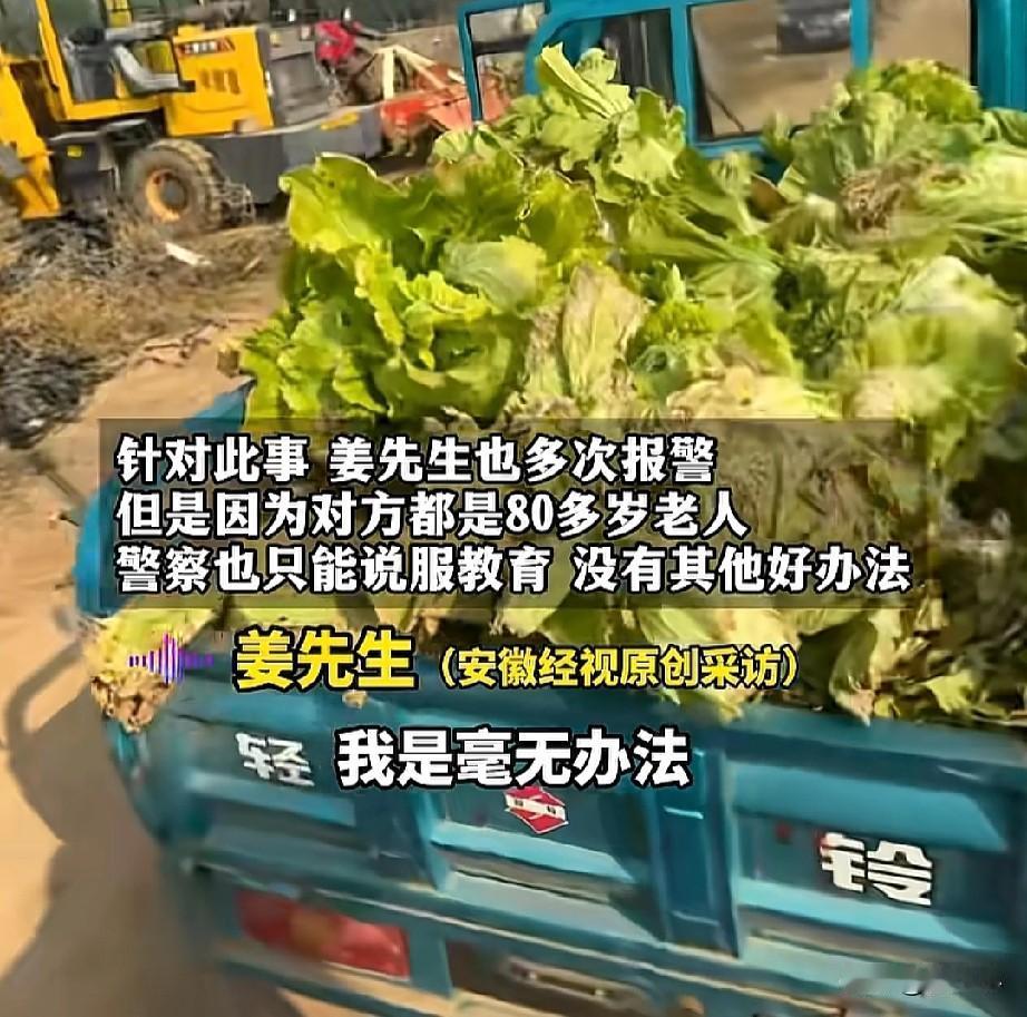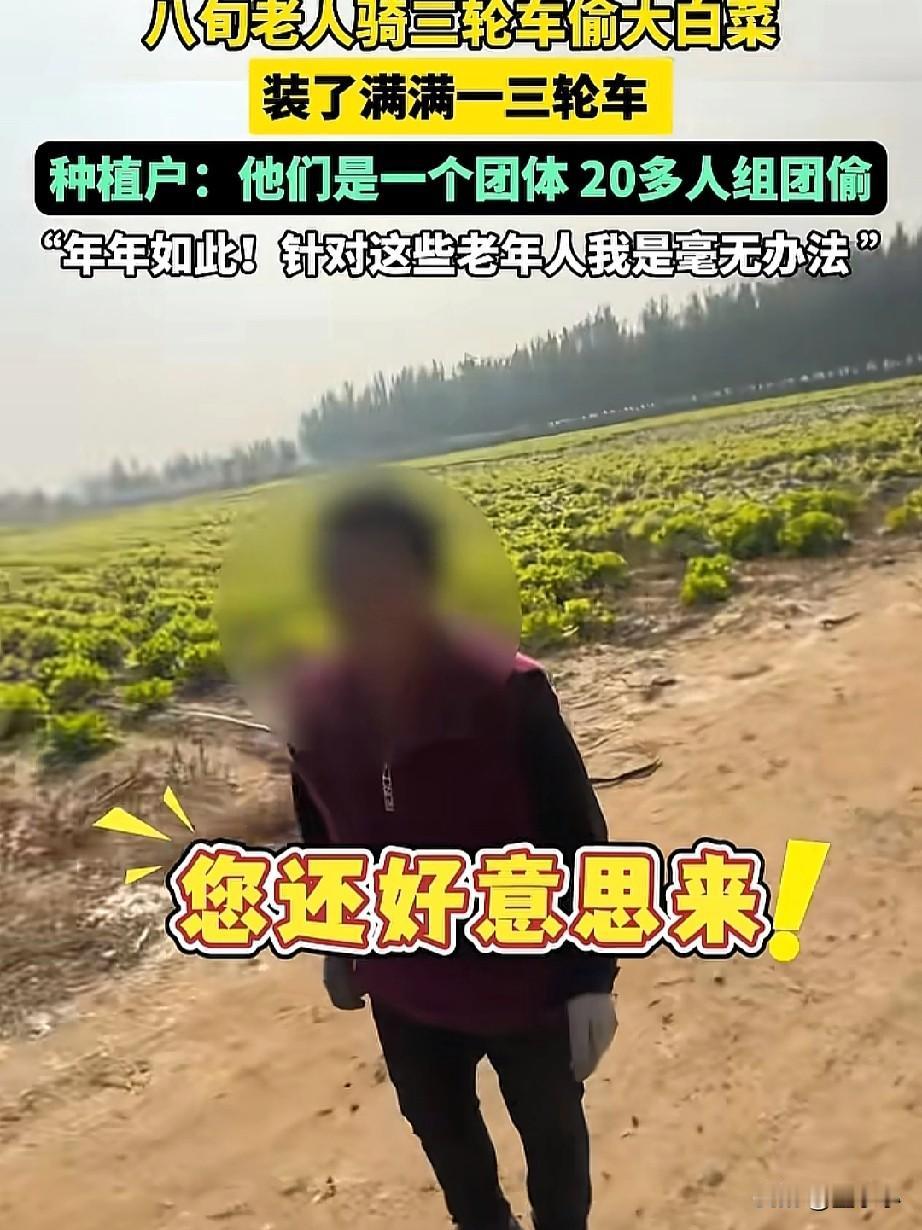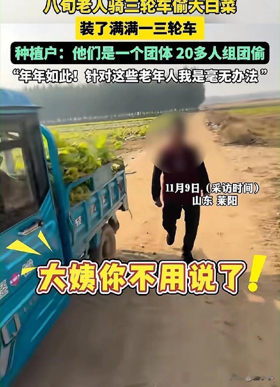 山东莱阳,八旬老人组团骑车去偷大白菜,个个的三轮车装的可都是满满的,这让种植户头疼不已,年年来,又不能拿他们怎么样,针对这些老年人是毫无办法了。 姜先生承包了一大亩地种些蔬菜,然而却经常有些老人过来偷菜,不是偷一点半点的,而是骑着三轮车过来装的满满的。 尤其,这些老人还是一个团体的,有20多人组团,对于这样的情况,姜先生真是有苦难言,因为他们也不是一次两次了,而是年年都如此。 今年本来就亏了,大白菜现在也不是收获的季节,就想让它们在长大一些。没想到却被一帮老人都装走了。 针对此事,姜先生也多次报警,奈何这些老人也有80多岁了,帽子叔叔只能说服教育的,也没有其他好的办法了。 有网友指出,不要惯着!不要因为年龄而可怜!必须让他们赔偿。 对此,大家怎么看? 不妨留下你们的看法!