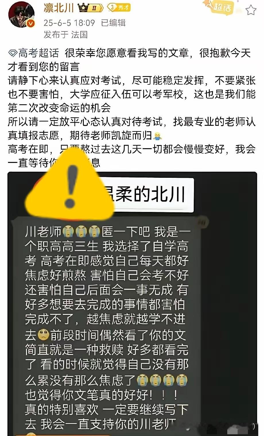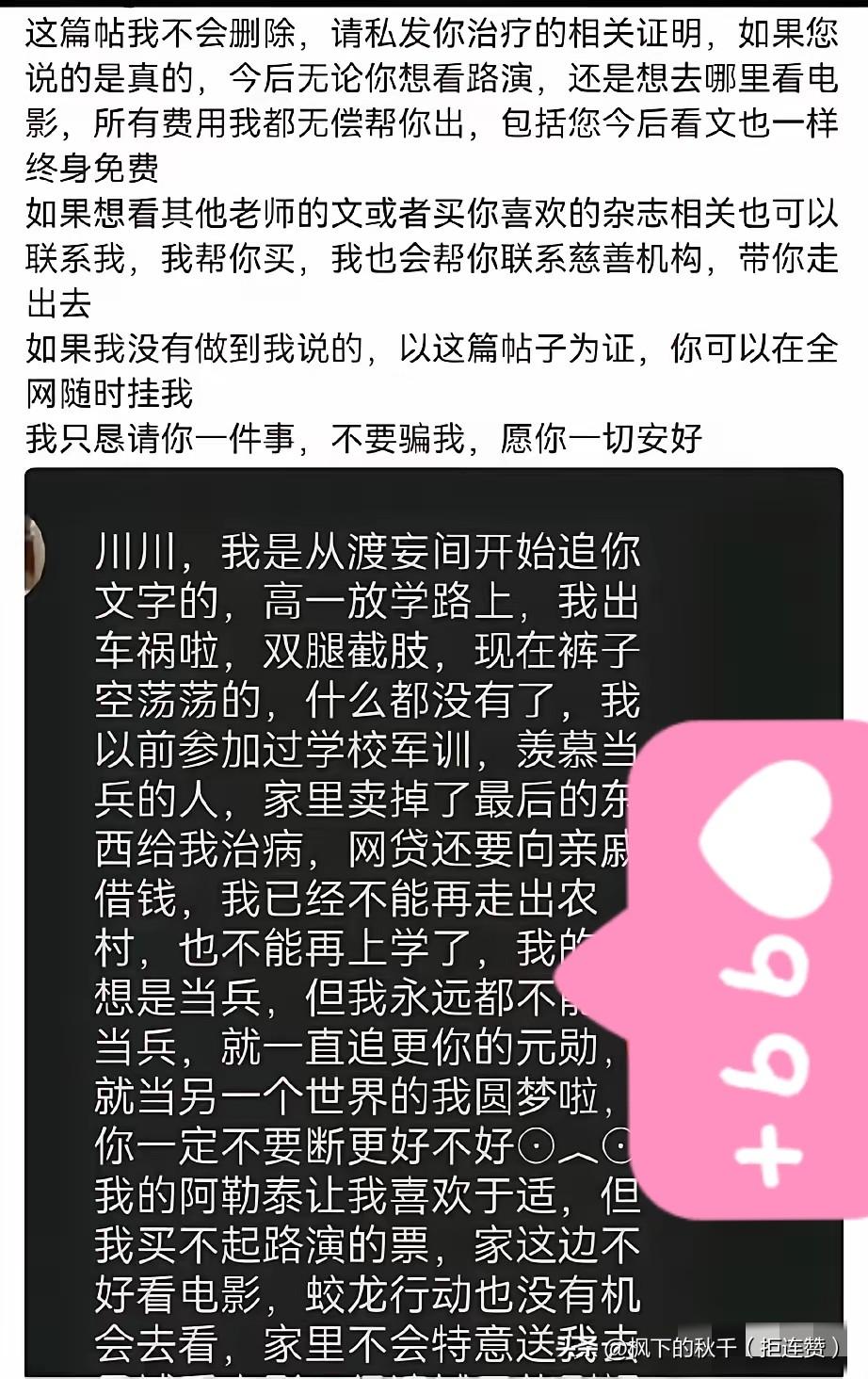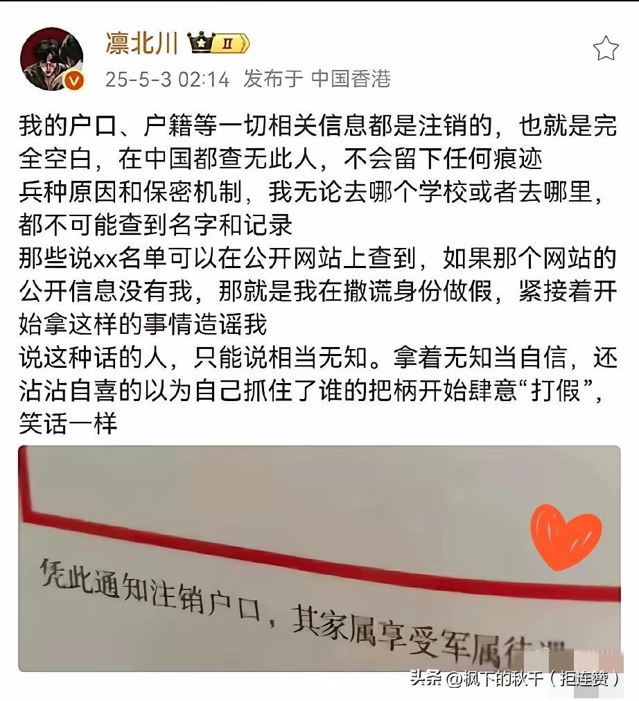 凛北川那11个帖子真的看得人热血翻涌,这才是刻在国人骨子里的精气神!谁说现在的人都只图安稳?他用行动砸破了这种偏见。 当过边防特战队员,爷爷埋骨抗美援朝战场,父亲以身殉职,三代忠烈的风骨在他身上藏不住。明明是写文百万字的小说家,却偏要为真相硬刚,哪怕被网暴、号可能没了也不低头,说“号废了人废了我也会还”。更难得的是心细,粉丝说截肢圆梦当兵难,他立马承诺全包后续费用,还把账号收益全捐公益。 有人说他不普通,我倒觉得他最珍贵的是“普通”——普通到见不得不公,普通到把家国放在心上。这种藏在烟火里的骨气,才是最动人的。 你被他哪句话戳中了?评论区说说,咱们一起等正义落地~