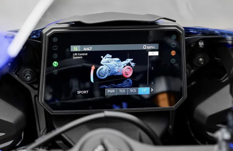 2026款YZF-R7的电控系统实现了代际跨越。雅马哈为这款中量级跑车配备了与旗舰R1同源的6轴IMU,使其首次具备感知车辆姿态的能力。基于IMU的数据支持,新款R7现在拥有一整套精密电子骑行辅助系统。Yamaha Ride Control系统整合了Sport、Street和Rain三种骑行模式,另加两个自定义模式,可通过“MyRide”应用程序进行个性化调整。