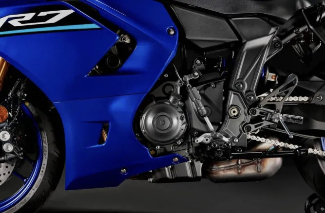 新款YZF-R7延续了与MT-07同源的689mL CP2并列双缸发动机,采用270度曲轴设计,在8750转时输出72.4匹马力。尽管动力数据与现款基本持平,但雅马哈通过技术优化实现了“隐性升级”。Y-CCT电子节气门系统取代传统机械节气门,由ECU精准控制进气开度,使扭矩输出更线性,油门响应细腻度提升30%。散热系统也做了升级,新增侧面导流板与水箱后侧导流装置,导流面积扩大15%,有效降低高温工况下的功率衰减,为未来动力提升预留空间。第三代快速换挡系统成为标配,允许骑士在不收油门的情况下进行升降档操作,使赛道和激进骑行更加顺畅专注。