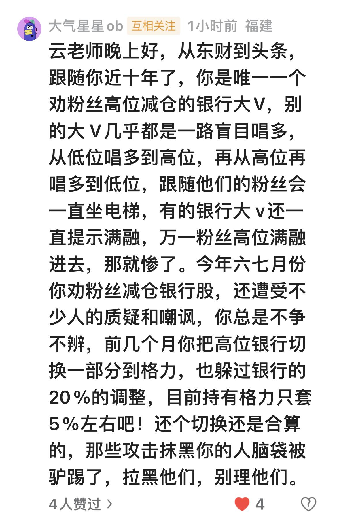 看了股友一段留言,很暖心!也很感动! ………………………………………… 原文:云老师晚上好,从东财到头条,跟随你近十年了,你是唯一一个劝粉丝高位减仓的银行大V,别的大 V几乎都是一路盲目唱多,从低位唱多到高位,再从高位再唱多到低位,跟随他们的粉丝会一直坐电梯,有的银行大 v还一直提示满融,万一粉丝高位满融进去,那就惨了。今年六七月份你劝粉丝减仓银行股,还遭受不少人的质疑和嘲讽,你总是不争不辨,前几个月你把高位银行切换一部分到格力,也躲过银行的20%的调整,目前持有格力只套5%左右吧!还个切换还是合算的,那些攻击抹黑你的人脑袋被驴踢了,拉黑他们,别理他们。 …………………………………. 本人写作的终极目标:希望朋友们能够在股市上赚到钱! 5万多粉丝背后是5万多个家庭,能够让这么多家庭幸福美满!这才是我坚持写作的动力! 我相信在这里的老朋友,受本人文章影响而投资高股息低估值,大多数都赚到钱。 因为在低位、我才会叫朋友们越跌越买;在高位、我也会叫朋友们分批减仓! 遇到喷子,也不用理会,可以屏蔽! 遇到善良,加个关注,吸收正能量! 写作是一种修行,助人亦渡己! ……………………………………..