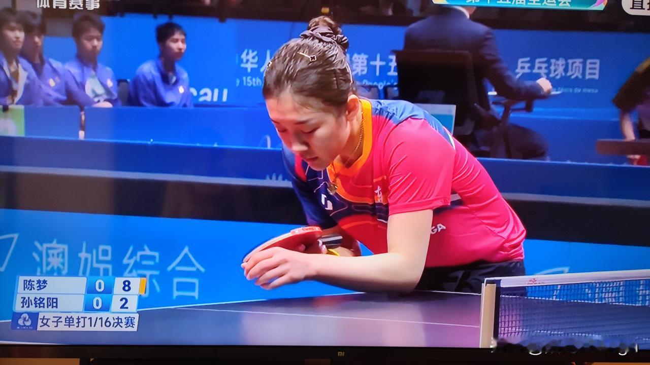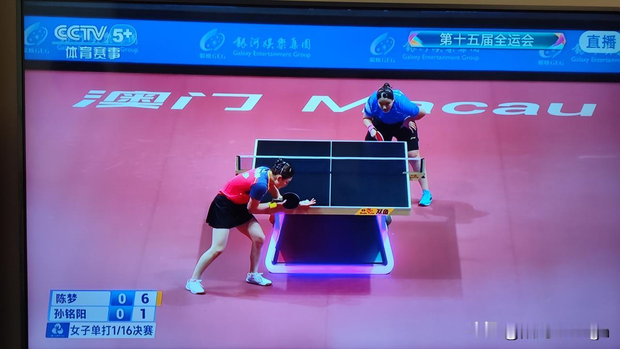 陈梦是全运会乒乓球赛场上一道靓丽的风景线! 终于又看到了长相漂亮、身材轻盈,打球观赏性极强的陈梦出现在全运会赛场!并看到了山东队的、在奥运会上为陈梦加油的帅哥教练。 陈梦今天12点半复出首秀,无论是球技、状态恢复的都非常好,4比0战胜对手孙铭阳。 陈梦在首局就进入状态,比赛的节奏掌握在自己手中。孙铭阳和陈梦对决,自信心明显的不足,完全是跟着陈梦的节奏在走。第一局,陈梦11比5胜出。 第二局,陈梦以同样的比分11比5胜出,孙铭阳基本上没有什么好的得分办法? 第三局,孙铭阳彻底乱了,陈梦11比3胜出。两人的实力差距还是很大的。尽管在第四局一开始的时候,孙铭阳占有比较明显的优势,打出了几个漂亮的球,以五比零领先,但很快就被陈梦追了上来,11比七拿下胜利! 这场球又让我们看到了那个赛场上霸气、沉稳、有厚度、打球极具观赏性的陈梦,相信她在全运会赛场上会大放光彩,取得好成绩!