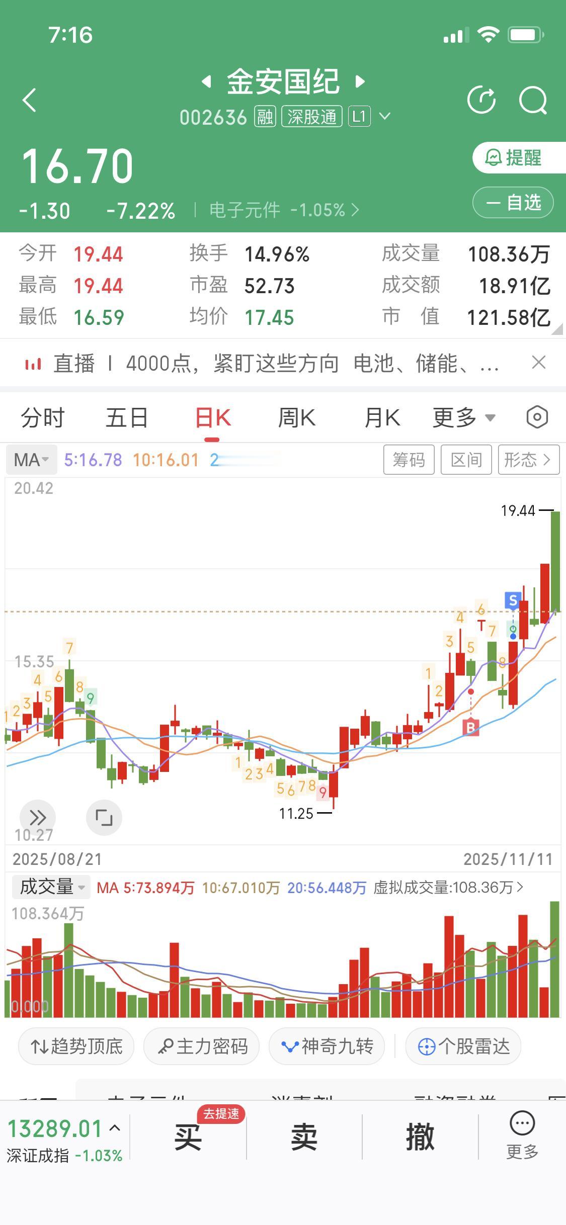 金安国纪这票真是把我折腾惨了,我直接卖飞,肠子都悔青了。这票背后的庄跟我玩起了心理战,每天不是涨停就是跌停,坐过山车都没这么刺激。 就像股吧里说的,昨天有4 - 5亿散户资金在均价线16.60以上追高进来,大家都在硬扛,看谁先撑不住。在散户眼里,都盼着股票快速翻倍或连续涨停,结果很多人一看到涨20%就冲动追进去,最后可能就被收割。这庄的洗盘手法太狠,换做谁能稳稳拿住啊,我算是被上了一课。