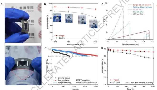 图说:从物理柔韧性(a)→弯曲对电性能的影响(b)→机械力学强度(c)→光照下长期发电稳定性(d)→湿热环境耐久性(e),系统性地验证“柔性设计”是否在保留器件柔性的同时,保障了光电性能与环境稳定性