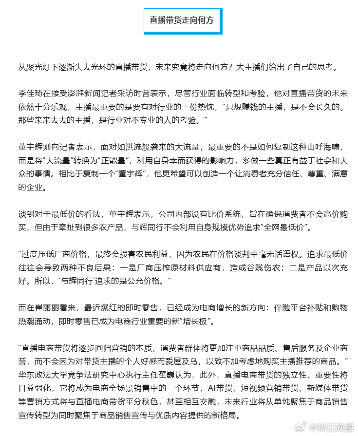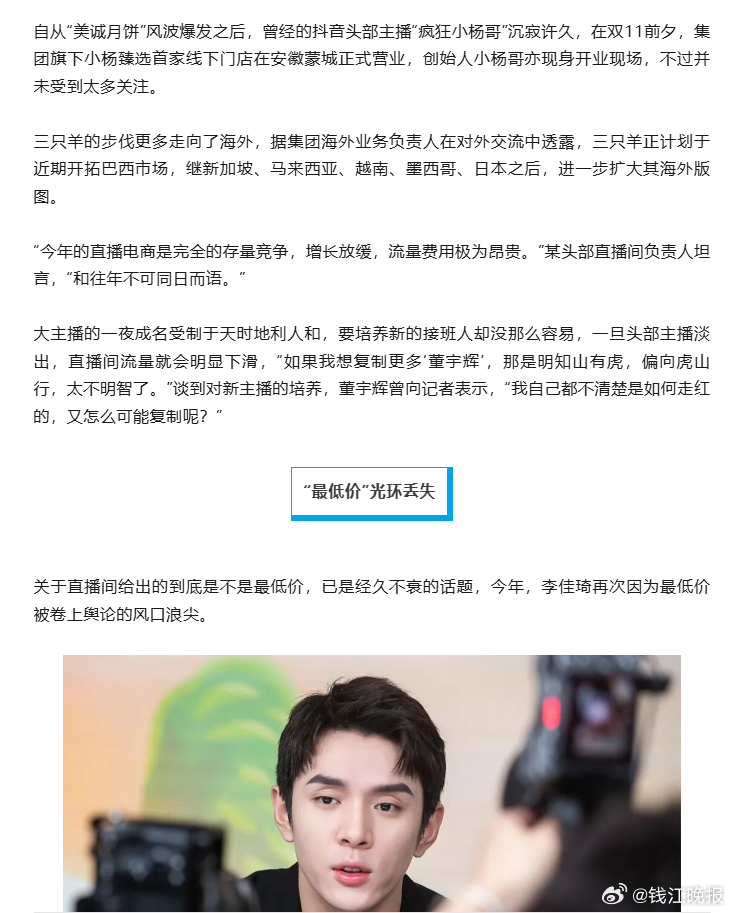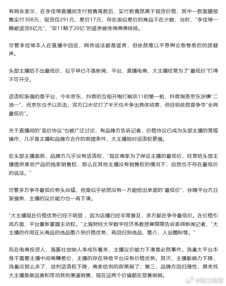 【】一年一度的双11落幕,今年的头部主播们,仿佛集体“隐形”。“在检查肺部后,医生说我的肺部像95岁的人,如果不治疗,未来会越来越严重。”今年8月,辛巴在直播间中官宣退网,1亿粉丝账号移交公司,公司将由妻子初瑞雪来管理。 其他的大主播们也被网友们调侃是“躺平”:作为直播圈最经久不衰的大网红,李佳琦在直播中坦言自己“被逼想退休”,“被营销号搞得里外不是人,我也是个人不是神。”交个朋友头部主播罗永浩在全网关注的西贝一事后再次淡出直播江湖,悉心钻研起了科技播客,在双11当天发布和刘谦的对话视频,而非给直播间站台卖货。“我不是一个商业目的特别强的人。”知名主播董宇辉曾向澎湃新闻记者坦言,“那种人往往会让人不舒服,跟你说话的时候,就想着怎么利用你,掏空你的价值。”他表示,“我不会牢牢控制一家公司,大家冲刺上市、财富自由,疯狂尖叫和欢呼。我不是这样的人,这不会让我快乐。”今年双11的促销周期再次拉长,再次刷新“史上最长双11”纪录,和以往火热数据不同,今年头部直播间的战报似乎集体熄火:只有“表现稳健”“增幅显著”等模糊披露,更多直播间则选择沉默。有关大主播的质疑声更是此起彼伏:无论是小杨哥的美诚月饼,东北雨姐的红薯粉条,脱掉“全网最低价”的光环后,双11的直播间还剩下什么?(澎湃新闻)