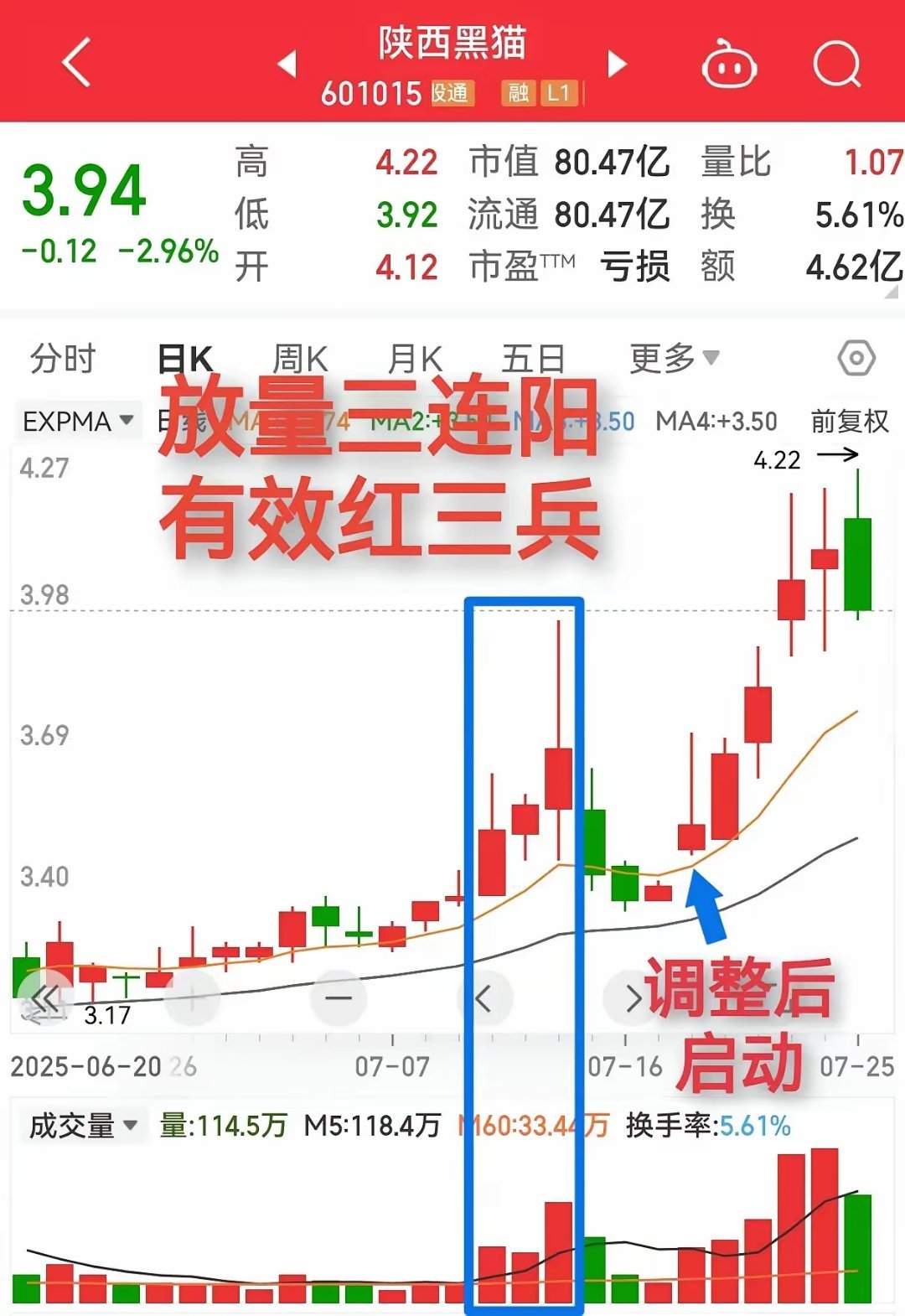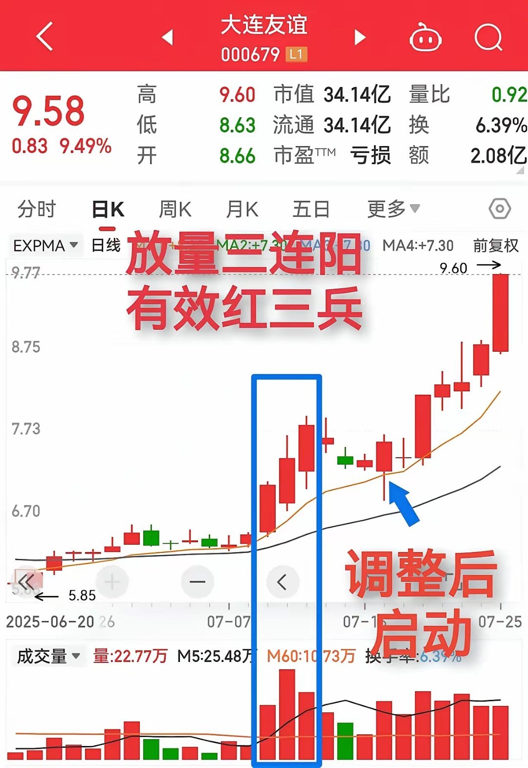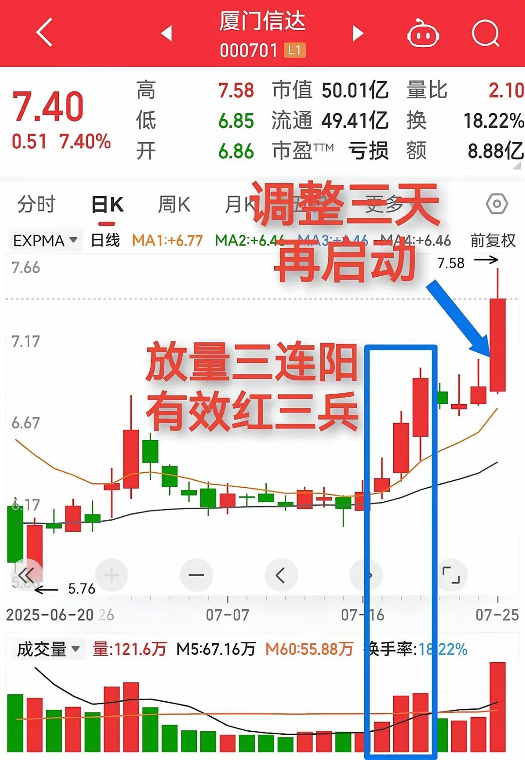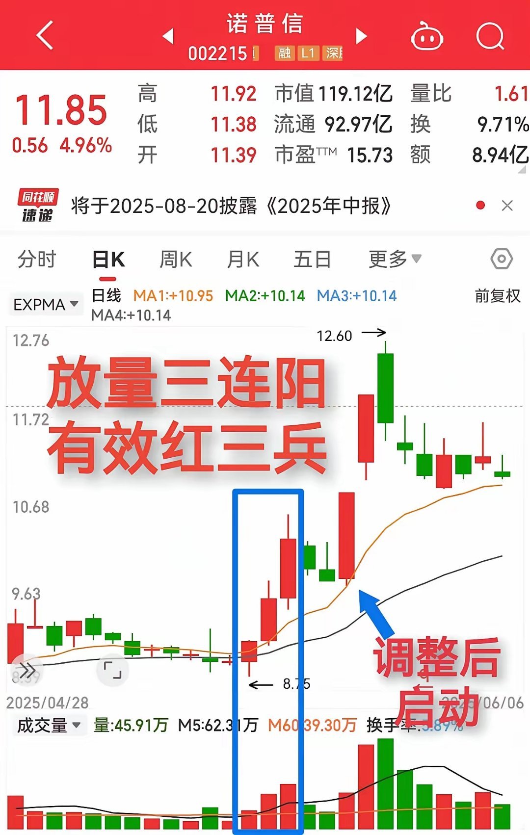 真假红三兵,慧眼来识别,量价如配合,悠然待凯旋。红三兵形态,很多人都知道,已经烂大街了,大多数软件里面都有这种条件选股栏,但是软件里面选出来的多数不真正符合条件,看得人迷茫,主要是成交量和股价的配合并不理想。这里贴几幅图,算是比较成功的红三兵走势。有人总是看到贴图后,就认为会立即上涨,心急火燎的,然后被套住了,又觉得这种走势无效或成功率不高,却没有仔细分析得失原因。红三兵形态,股价连续上涨,上涨幅度以每日三到五个点,三日涨幅六到十个点为佳,成交量倍量连续放大为好。多数红三兵出现后会有所调整,调整后再次放量上升时,可视作启动点。调整的时间不等,多数调整时间在三日之内,然后放量启动,个别会调整多日,但是这种调整幅度不应太大,以不跌破第一个阳线实体底部为好,否则视之为失败案例。看我贴图的,如果会看,我贴出了红三兵形态走势图,什么情况下能跟,什么情况下要等,就会自己观察而后定。而不会看者,只知道抱怨,第二天没涨啊,水平不行啊,而且还会说我在骗人之类的话。说这些话的人,有的股坛新人是真不懂,不知者不怪。而有的人是懂的,故意使坏,其心可诛。还是那句话,来到股场,你也要学点东西才好。