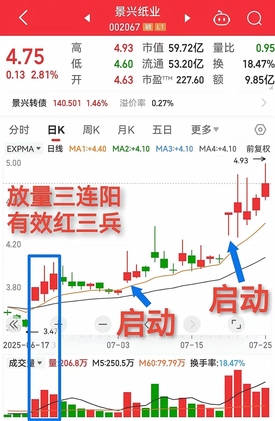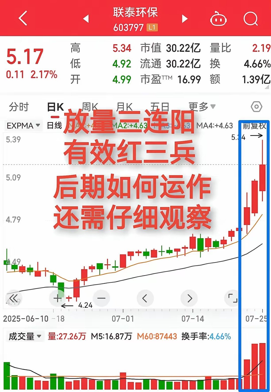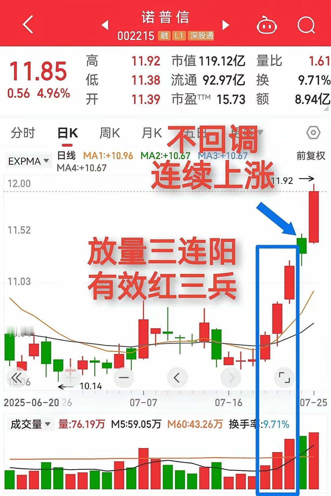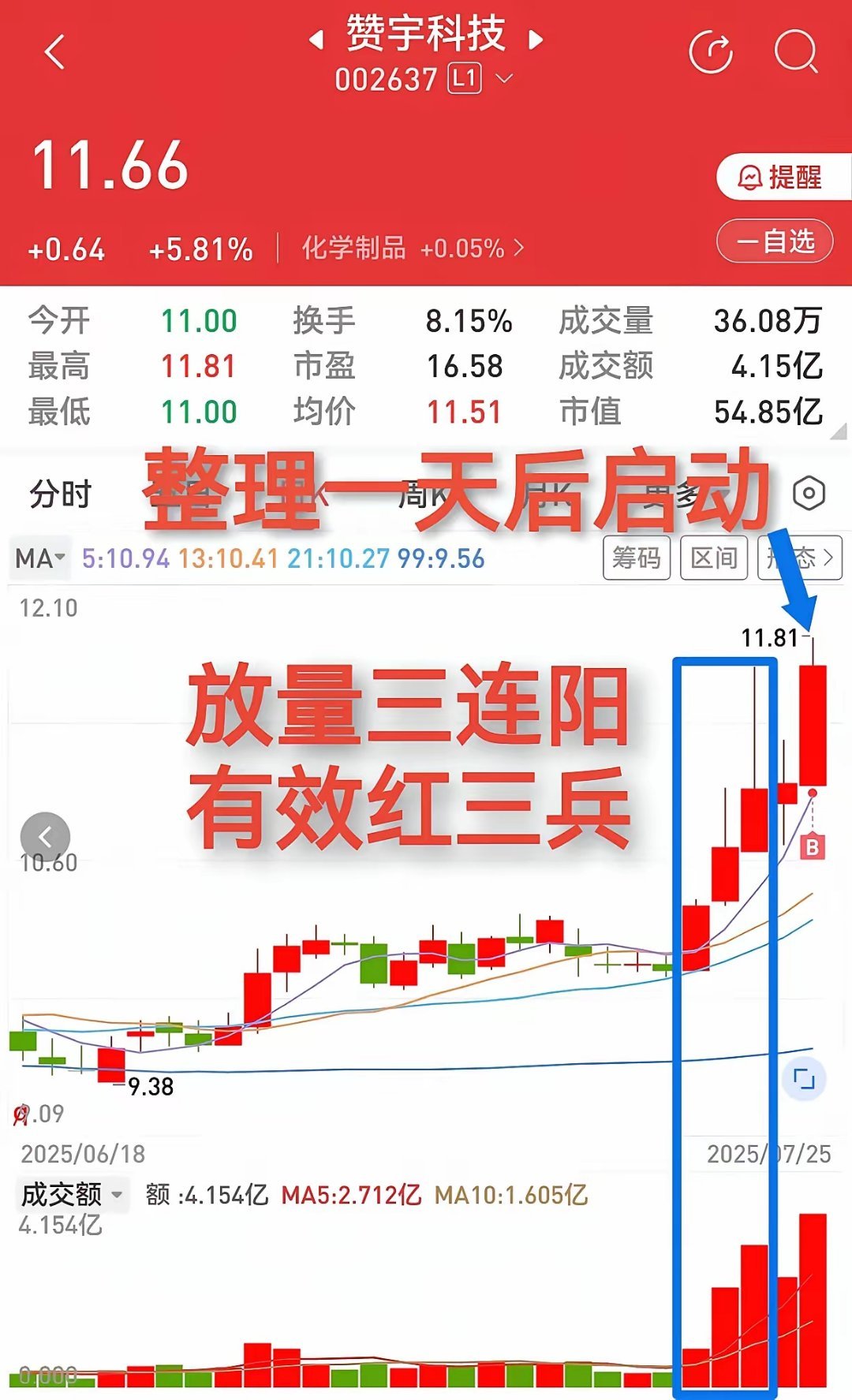 真假红三兵,慧眼来识别,量价如配合,悠然待凯旋。红三兵形态,很多人都知道,已经烂大街了,大多数软件里面都有这种条件选股栏,但是软件里面选出来的多数不真正符合条件,看得人迷茫,主要是成交量和股价的配合并不理想。这里贴几幅图,算是比较成功的红三兵走势。有人总是看到贴图后,就认为会立即上涨,心急火燎的,然后被套住了,又觉得这种走势无效或成功率不高,却没有仔细分析得失原因。红三兵形态,股价连续上涨,上涨幅度以每日三到五个点,三日涨幅六到十个点为佳,成交量倍量连续放大为好。多数红三兵出现后会有所调整,调整后再次放量上升时,可视作启动点。调整的时间不等,多数调整时间在三日之内,然后放量启动,个别会调整多日,但是这种调整幅度不应太大,以不跌破第一个阳线实体底部为好,否则视之为失败案例。看我贴图的,如果会看,我贴出了红三兵形态走势图,什么情况下能跟,什么情况下要等,就会自己观察而后定。而不会看者,只知道抱怨,第二天没涨啊,水平不行啊,而且还会说我在骗人之类的话。说这些话的人,有的股坛新人是真不懂,不知者不怪。而有的人是懂的,故意使坏,其心可诛。还是那句话,来到股场,你也要学点东西才好。