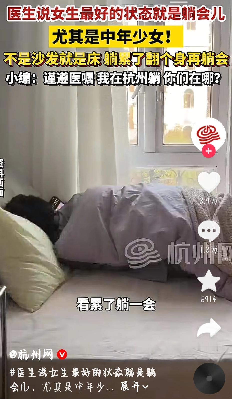你看,医生都说了,女生最好的状态,就是——躺会儿!尤其是咱们“中年少女”,可算找到理论依据了。 难怪我这么爱躺,坐着费腰,站着费腿,只有躺着,全身零件才表示舒适。 躺累了怎么办?简单,翻个面,换个姿势继续躺! 所以啊,人生信条➕1:没事多躺躺,躺赢才是真赢![害羞]