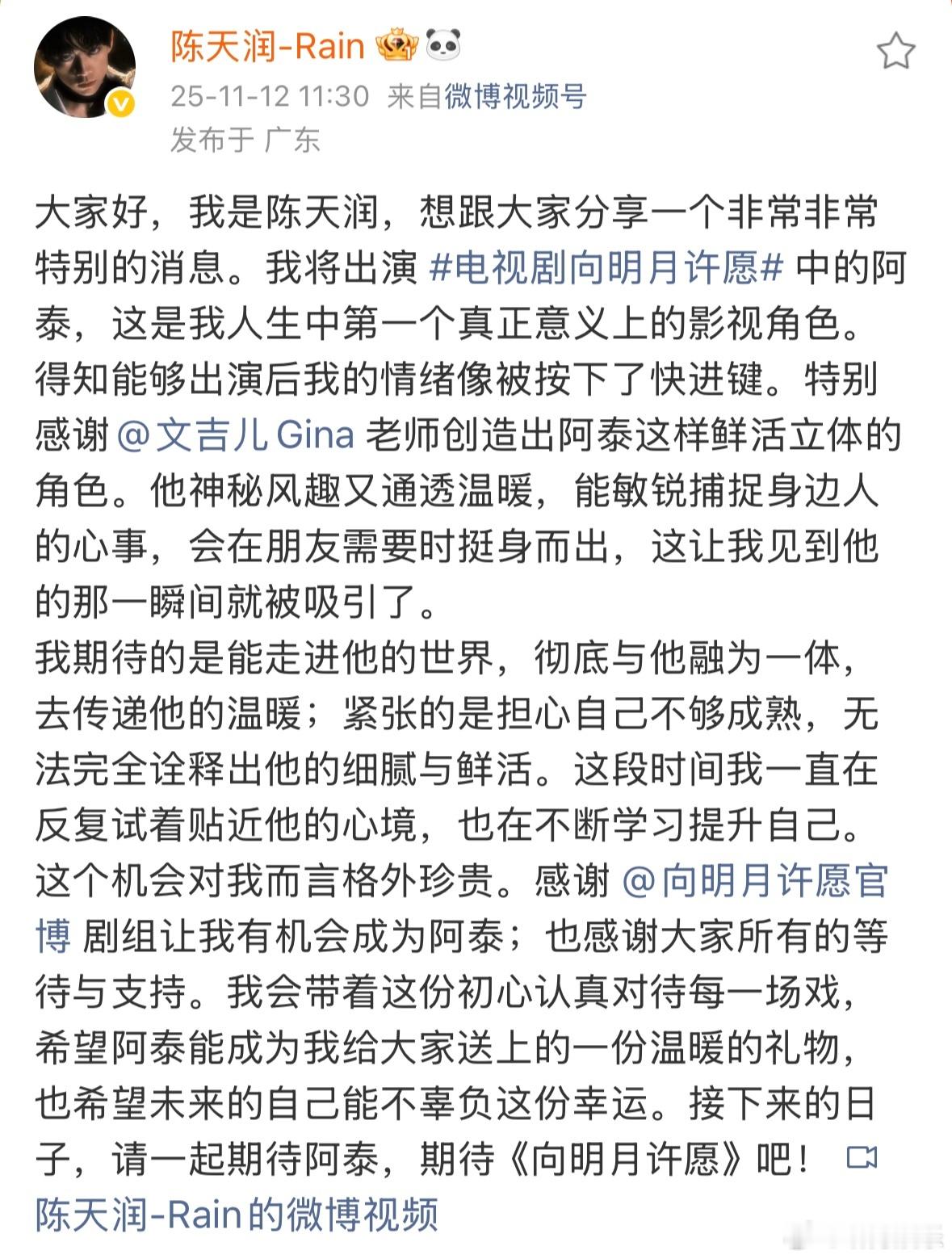 陈天润官宣将出演电视剧《向明月许愿》的男三阿泰!目前已经官宣的演员阵容还有:林小