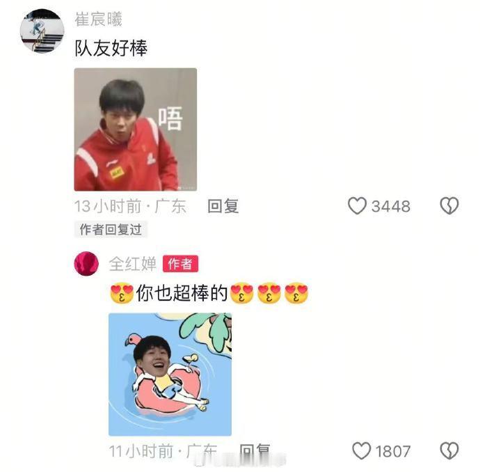 【】近日,第十五届全运会正在如火如荼的进行中,其中 助力广东队拿下跳水团体冠军,全运会之旅告一段落, 则夺得全运会女子街式滑板金牌。赛后,崔晨曦评论全红婵“队友好棒”,并配上一张王楚钦表情包,而“全妹”也不甘示弱,同样用上王楚钦表情包,为崔晨曦加油:“你也超棒”,网友:好可爱的互动!祝三位运动员在各自赛场越来越好!