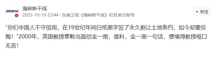 “中国人不守信用,在19世纪年间白纸黑字签了永久割让土地条约,如今却要反悔!”2000年,英国教授泰勒当面怼金一南,谁料,金一南一句话,便堵得教授哑口无言 众所周知,19世纪的中国签了一堆不平等条约,泰勒就是想拿这个堵金一南的嘴,把“不守信用”的帽子扣死。 可金一南半点没慌,他盯着泰勒手里的旧纸,慢慢拿起话筒,声音不大却字字千钧,第一句就炸了场:“泰勒教授,您手里的不是什么‘信用凭证’,那是刻在中国人骨头上的血泪账!”这话一出口,泰勒拿着条约的手都顿了一下。 那些条约里藏着的苦难,老辈人提起都心疼到发抖,就说第一个不平等条约《南京条约》,1842年的夏天,英国军舰“皋华丽号”堵在南京江面,炮口对准城墙,清政府代表耆英在船舱里签下屈辱字句。 香港岛被割走不算,还要赔偿两千一百万银元——这笔钱相当于当时清朝全年财政收入的三分之一,最后全摊到百姓头上,江浙一带的赋税瞬间涨了五成,多少农户卖儿卖女才能凑够税银。 开放的广州、厦门等五处通商口岸成了洋人的乐园,洋布洋纱潮水般涌入,本土手工业者瞬间没了活路。苏州河畔的织户们把传了三代的织机砸得粉碎,抱着发霉的棉纱坐在河边痛哭,原本热闹的织里巷不到半年就变得荒草丛生;香港岛上的渔民被英国殖民者赶出世代居住的海湾,只能驾着小舢板在礁石缝里捡拾贝壳,不少人连人带船被风浪掀翻,连尸体都找不到。 看到清朝软弱可欺,日本也跟着趁火打劫,1895年的《马关条约》更是狠到骨子里,赔偿金额高达2.315亿两库平银,加上汇差损失,实际支付超过2.597亿两,折合日金3.895亿日元——这相当于日本当时年度财政收入的4.87倍。 更屈辱的是,台湾和澎湖列岛被强行割让,消息传到台湾,全岛上下哭声震动天地,诗人丘逢甲写下“四百万人同一哭,去年今日割台湾”的诗句,带着乡亲们歃血为盟,组建义军反抗,他振臂高呼“愿人人战死而失台,决不愿拱手而让台”,义军战士们拿着大刀长矛、土枪土炮,在新竹、彰化一带与日军展开血战,徐骧率领的民团在八卦山用血肉之躯抵挡日军的炮火,上千名战士全部壮烈牺牲,山头上的泥土都被鲜血染红。 可手里的冷兵器怎敌得过洋枪洋炮?日军登陆时,台南的老人们跪在地上朝着大陆的方向磕头,额头磕出鲜血,孩子们哭着拽住父母的衣角问“为什么不要我们了”。 泰勒可能不知道,从鸦片战争到新中国成立,中国被迫签了一千多个不平等条约,平均每年都要签好几个,这些条约让中国失去了上百万平方公里的领土,数十亿两白银的赔款,还有关税自主权、领事裁判权等数不清的主权。 那些所谓“利益均沾”的规矩,说白了就是列强看中国好欺负,轮流来抢,英国割了香港,法国就占了广州湾;德国强租胶州湾,俄国就把东北划成势力范围,上海的租界更是成了“国中之国”,外滩的洋行老板们在豪华餐厅里喝着香槟,窗外就是衣衫褴褛的中国劳工;租界里的外国巡捕可以随意殴打华人,而中国官员却无权过问。 1904年,上海租界甚至越界筑路,把扩张的黑手伸到闸北地区,当地居民反抗时,竟遭到巡捕的野蛮镇压,北京的圆明园被烧得只剩下断壁残垣,当年被抢走的《女史箴图》现在还摆在大英博物馆里,标注着“1860年缴获”的字样;那些精美的青铜礼器成了外国富豪书房里的摆设,谁还记得它们本该矗立在中华大地的庙宇之中。 可到了2000年,中国早已不是当年任人宰割的模样,从长春一汽的第一辆解放卡车驶下生产线,到大庆油田的钻机轰鸣;从两弹一星的惊天巨响,到杂交水稻养活亿万人口,工业体系从无到有,科技成果不断突破,教育普及让亿万国人睁眼看世界,再也没人能拿着几张旧纸就随意指责。 历史从不是冷冰冰的文字,而是活生生的血泪,是代代相传的记忆,那些不平等条约从来就不是什么“信用凭证”,而是列强用坚船利炮逼迫中国签下的卖身契,是刻在民族脊梁上的屈辱印记。 中国从来不是“反悔”,而是在站起来之后,堂堂正正地对世界宣告:我们不承认任何强加的屈辱条款,我们要洗刷百年耻辱,找回本该属于自己的尊严。 如今,从香港回归时升起的五星红旗,到澳门大三巴前欢庆的人群;从海外文物追索行动中回国的青铜兽首,到国际舞台上中国维护发展中国家权益的坚定身影,都是对这段历史最好的回应。 泰勒们或许永远不会明白,一个曾被踩在脚下的民族,当她重新挺直腰杆时,守护的不仅是领土与主权,更是祖辈用血泪换来的尊严。 你觉得面对这样的历史,我们该沉默还是该奋起反击?评论区聊聊呗!