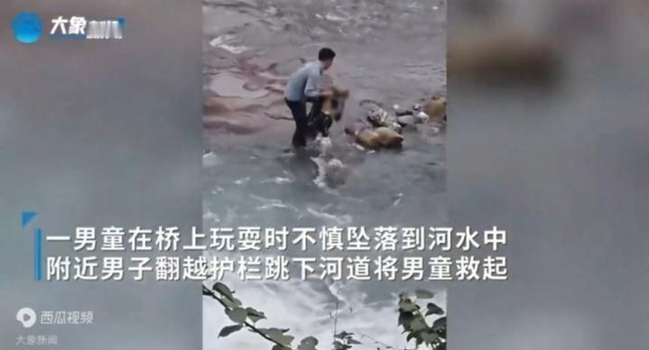 护栏外,幼童在激流中沉浮!一道黑影翻越护栏跃入河中 河水湍急,孩童的挣扎渐渐无