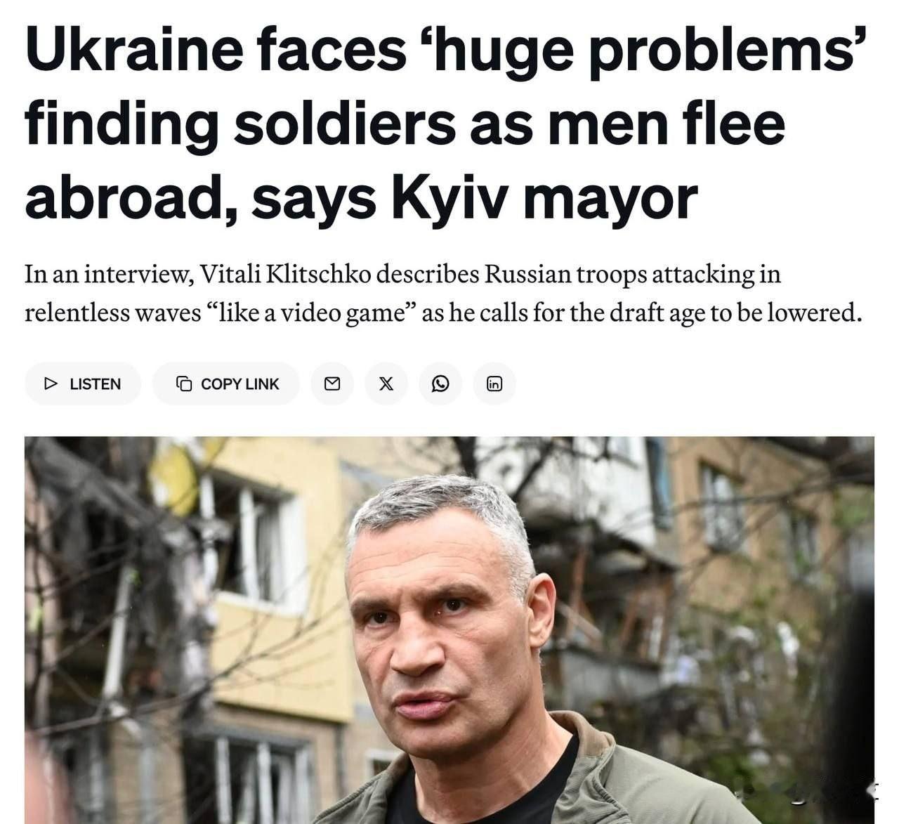 乌克兰基辅市长维塔利·克利奇科提议将公民义务兵役年龄从25岁降至22岁 “过去,18岁的年轻人就要参军,但他们还是孩子。现在,在乌克兰,只有25岁才能被征召入伍。年龄还可以再降低一两年——降到22岁或23岁”。 嗯……这位基辅市长的数学应该是体育老师教的,25减一两岁,成了22或23岁。 当然这不重要,重要的是他有三个孩子,如今都在国外。 在一篇 2024 年5 月的报道中,这位基辅市长接受采访说: “他们出生在国外,一直在国外生活。现在他们在不同国家学习。”
