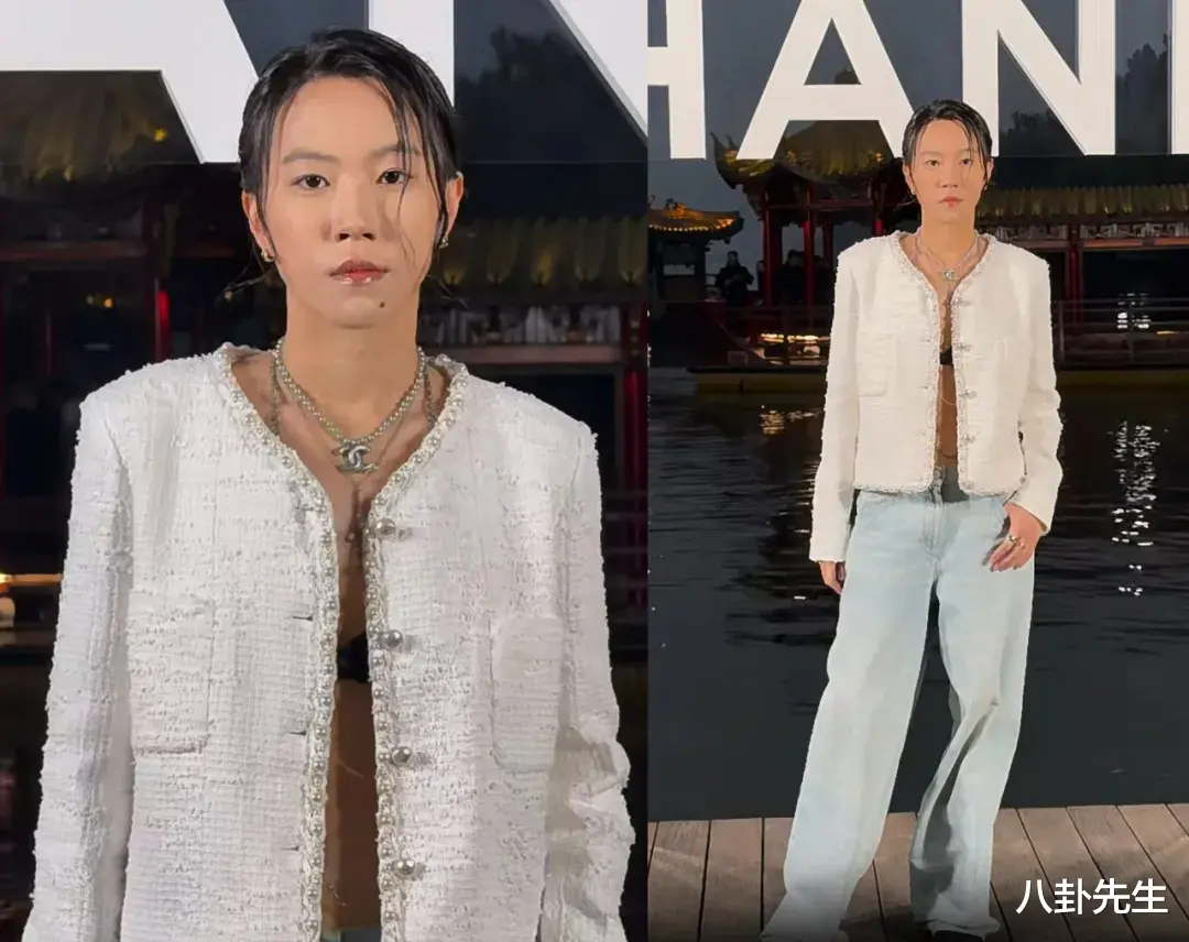 窦靖童单穿了一件白色软呢外套搭配牛仔裤,这还是八先生第一次看明星按照秀场模特那样单穿这种软呢外套的,又酷又飒。就算是难看的油头湿发,在这套造型里似乎也变得合理了。
