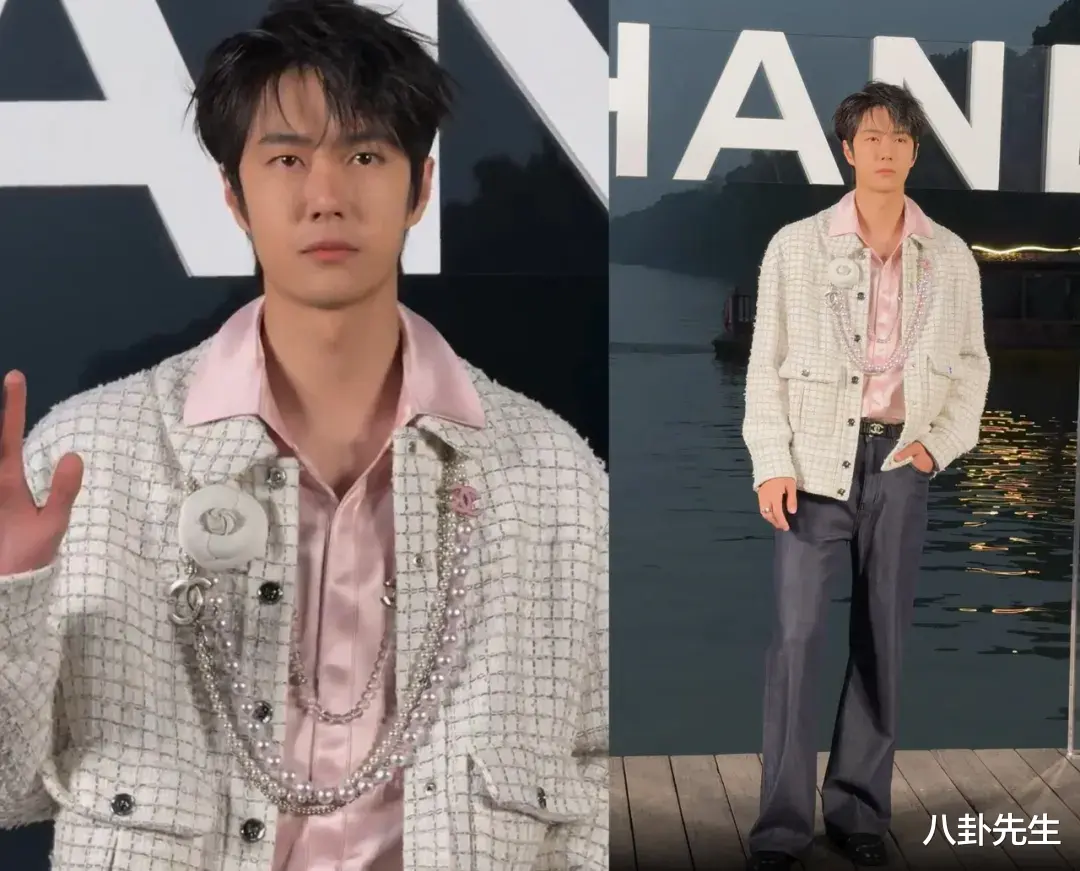 王一博穿了一件白色软呢外套和深灰色西裤,粉色衬衫增添了几分活泼的感觉,要是去掉那一大串累赘的珍珠项链应该会更好看。总的来说,这套造型还是很适合他的。
