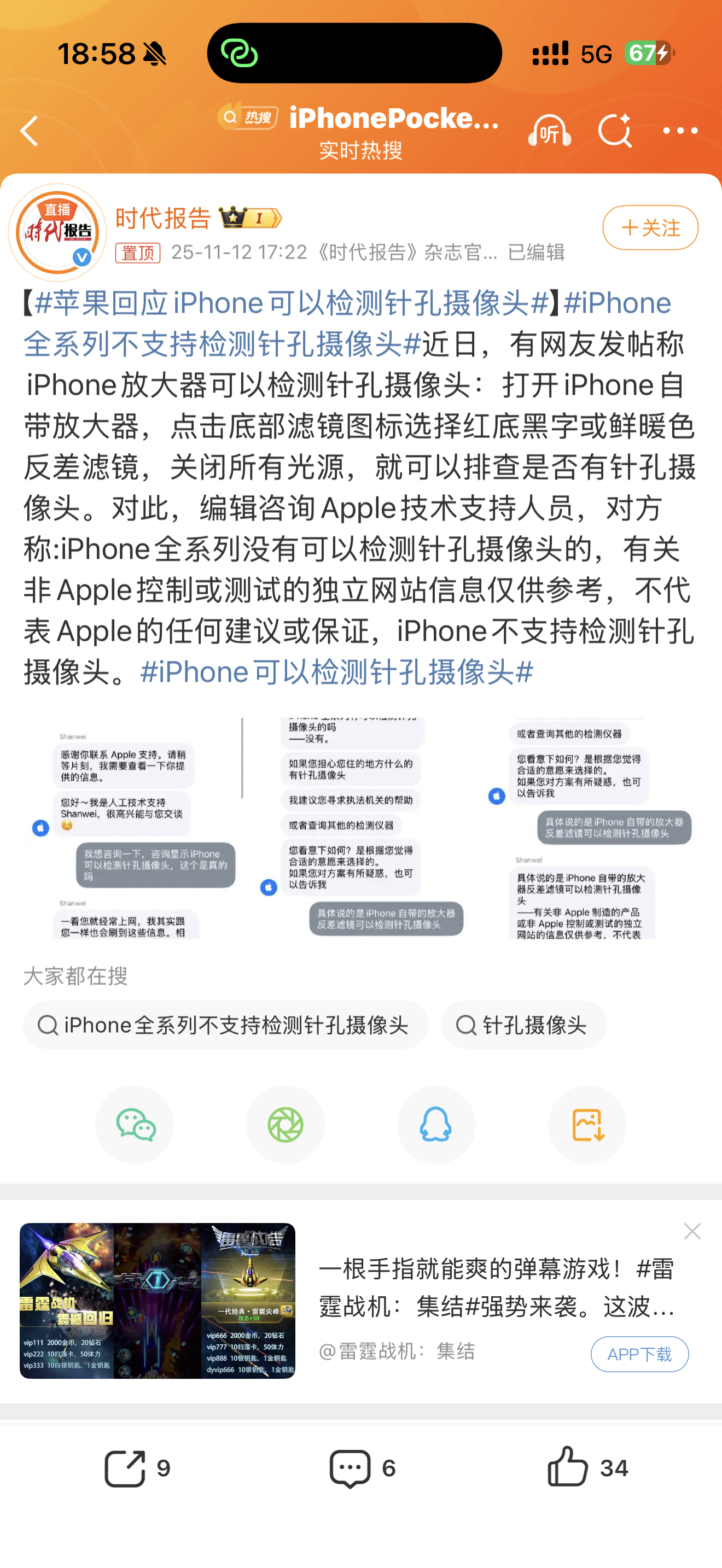 这不是逗我们吗?早上说iPhone可以检测针孔摄像头,晚上说不可以,那你中午干啥去了。幸亏我提前知道,这功能就算能用,也就是和测距离一样,鸡肋的一个功能,所以还是老老实实,买一个正儿八经的检测的。
