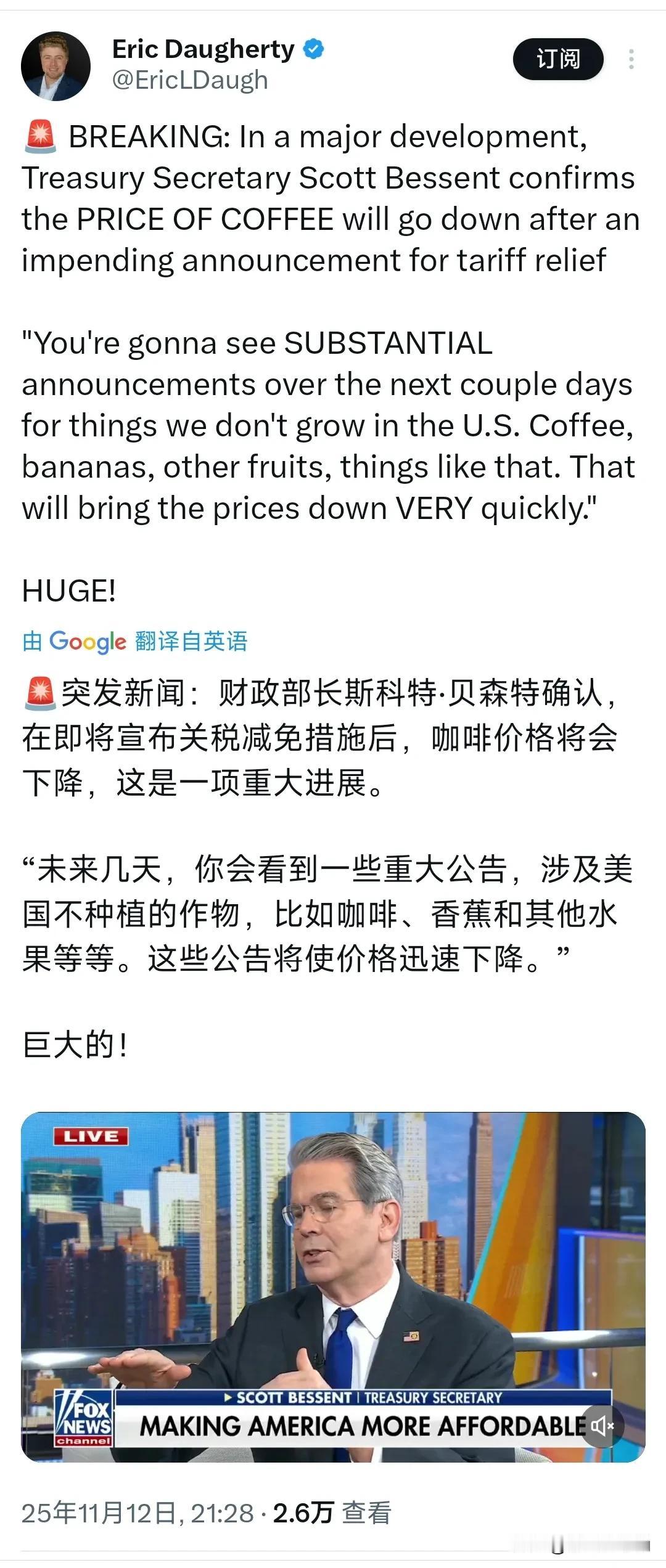 美国财政部长贝森特今晚(北京时间11月12日晚)确认,在即将宣布关税减免措施后,咖啡价格将会下降,这是一项重大进展。“未来几天,你会看到一些重大公告,涉及美国不种植的作物,比如咖啡、香蕉和其他水果等等。这些公告将使价格迅速下降。” 评几个 美国财政部长贝森特的这番表态,无疑是“此地无银三百两”,将美国关税政策推高物价的真相公之于众。此前,美国曾信誓旦旦地宣称关税将为美国带来巨大收益,甚至要给民众发放2000美元的补贴,如今却急于通过减免关税来降低物价,这种自相矛盾的做法,不仅让其“让美国再次伟大”的口号显得苍白无力,也再次证明了贸易霸凌行径终究是“搬起石头砸自己的脚”。关税本应是调节贸易的杠杆,却被美国滥用为打压他国的工具,结果不仅扰乱了全球产业链,也让美国消费者承受了高昂的生活成本。如今,美国财政部长亲自“打脸”,承认关税对物价的推高效应,可谓是“偷鸡不成蚀把米”,为全球贸易秩序的健康发展敲响了警钟。