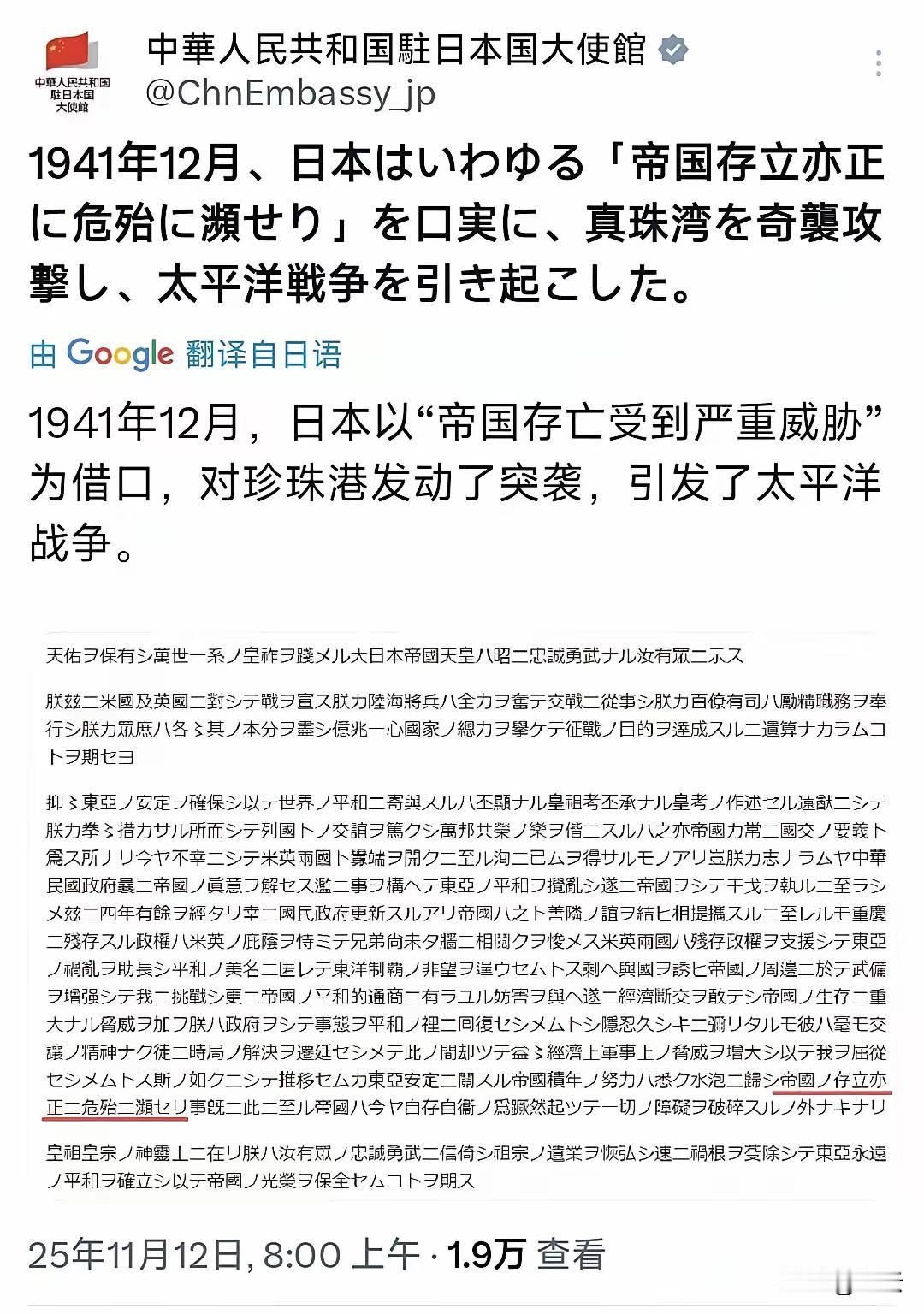 今天,驻日大使馆,官方发布了一条推文:其中,一句话,就能够让日本政界哑口无言,瑟瑟发抖! 11月12日,中国驻日大使馆一则推文直接引爆国际舆论!没有多余狠话,只用一句历史追问,就让叫嚣"武力介入台海"的日本政界瞬间哑口无言,再也不敢肆意妄为! 事情的根源,是日本首相高市早苗公然叫嚣:台海冲突可能构成日本"存亡危机",暗示要行使集体自卫权出兵干预。这已经不是日本政客第一次拿台海问题挑事,但这次驻日使馆直接撕开了他们的遮羞布——"1941年偷袭珍珠港,1931年九一八事变,日本哪次对外侵略,不是打着'国家存亡危机'的借口?" 一句话,串联起两段铁证如山的侵略历史!当年日本就是用同样的话术,制造伪满洲国、发动侵华战争、挑起太平洋战争,如今故技重施想插手中国内政,简直是痴心妄想!更打脸的是,高市早苗此前嘴硬宣称不会撤回相关言论,可在使馆推文发布后,立刻改口"避免类似表述",显然是被戳中了痛处。 要知道,日本作为二战战败国,《联合国宪章》明确规定其无资格干涉他国内政,如今却妄图在台海问题上兴风作浪,甚至喊出"台湾有事就是日本有事"的狂言。驻日使馆的推文,不仅是历史真相的还原,更是严正警告:历史不会重演,任何企图分裂中国、挑战战后秩序的行为,都必将付出惨痛代价! 中国内政不容任何外部势力指手画脚,台湾是中国不可分割的一部分,这是国际共识,更是铁的事实。日本政界若继续执迷不悟,只会让自己陷入万劫不复的境地! 驻日使馆硬核发声 台海问题不容干涉 历史真相不容篡改 ,一起为祖国的坚定立场点赞!你觉得日本政客该收敛了吗?欢迎在评论区留言讨论~