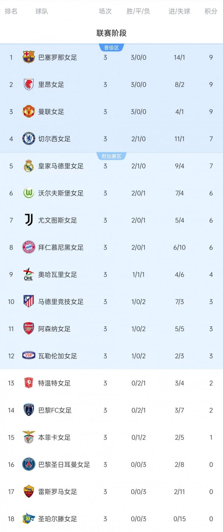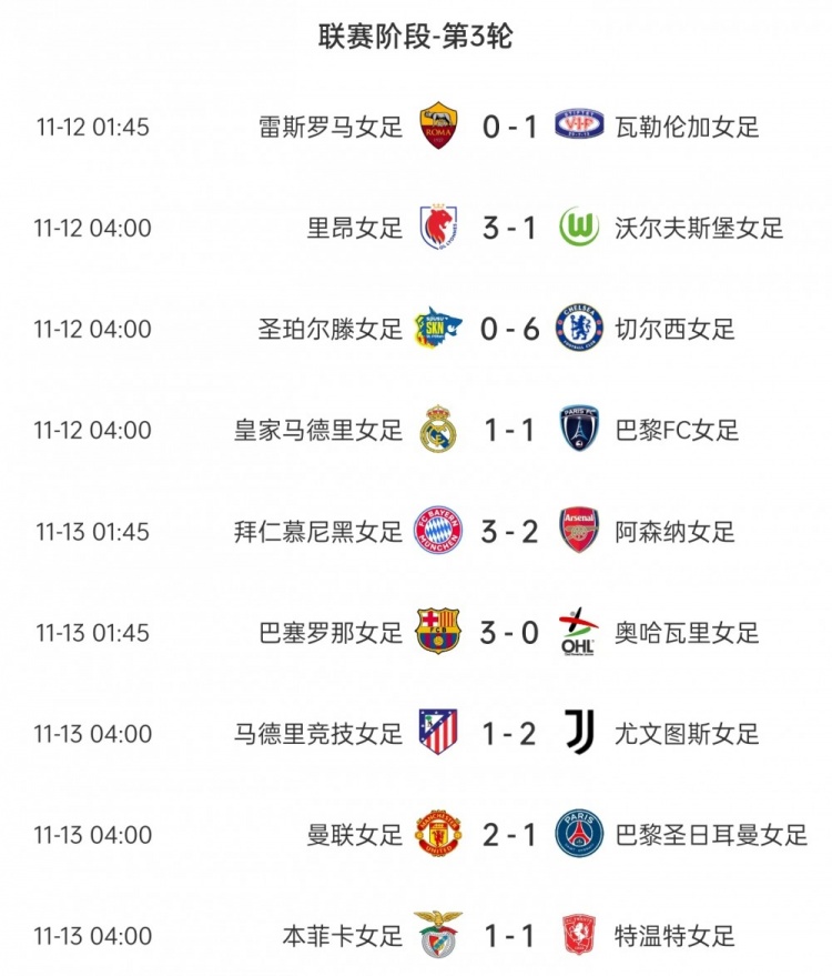 女足欧冠联赛第3轮赛果