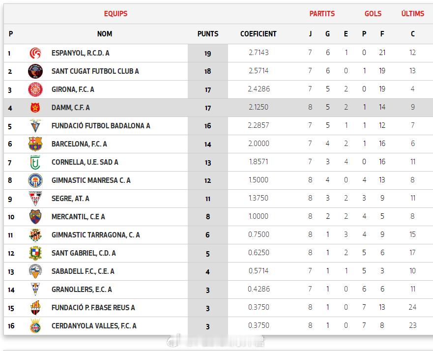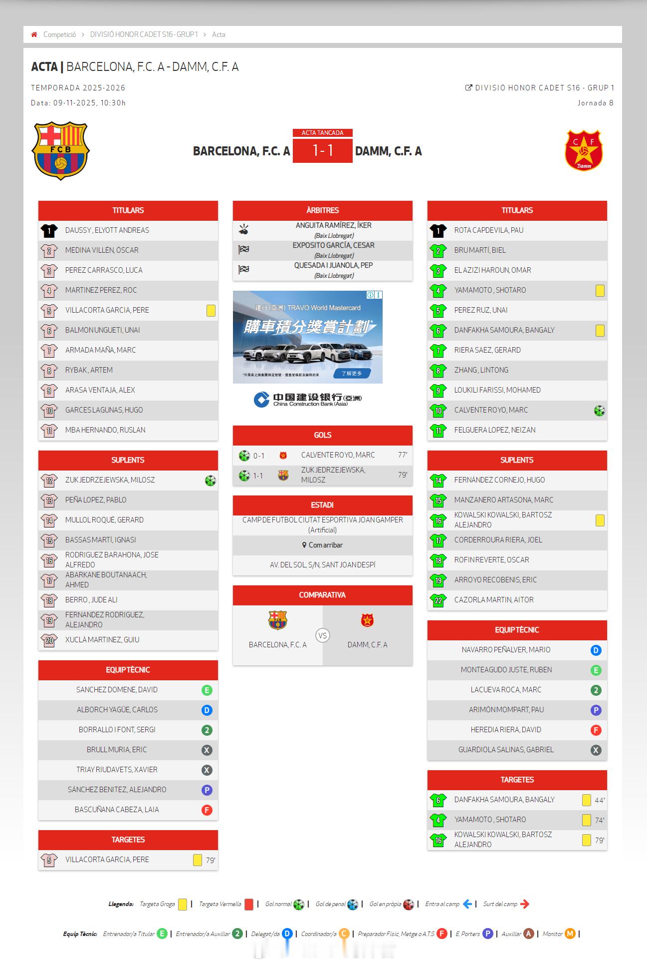 【西班牙加泰U16荣誉联赛(1) 第8轮】11月9日,达姆U16A队客场1比1战平 U16A队,中场张林峒(2010)首发出战。截至本轮,张林峒共8次进入大名单、首发6次,打进3球。球队取得5胜2平1负,暂列积分榜第4位。