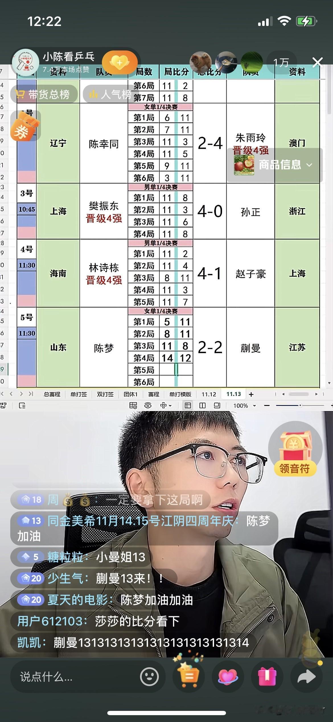 陈梦4:2战胜蒯曼晋级四强 全运会乒乓球女单1/4决赛 山东陈梦4:2江苏蒯曼 第一局蒯曼11:5战胜陈梦 第二局蒯曼11:8战胜陈梦 第三局陈梦11:8战胜蒯曼 第三局双方打到12:11,蒯曼局点,蒯曼叫暂停。暂停回来陈梦得分12:12,陈梦得分13:12,陈梦局点,陈梦得分14:12,陈梦赢下第四局。 大比分2:2平。 第五局,开局4:2,陈梦得分5:2,陈梦得分6:2,蒯曼发球直接得分6:3,陈梦得分7:3,陈梦正手进攻得分8:3,双方得分9:6,陈梦发球直接得分10:6、陈梦得分11:6。陈梦赢下第五局。 第六局,开局3:4,陈梦得分4:4,蒯曼连续得分4:7,双方得分5:8,陈梦正手进攻得分6:8,陈梦追平比分8:8,蒯曼得分8:9,陈梦反手得分9:9,陈梦正手进攻得分10:9,陈梦得分11:9。陈梦赢下第六局。 陈梦4:2战胜蒯曼晋级四强