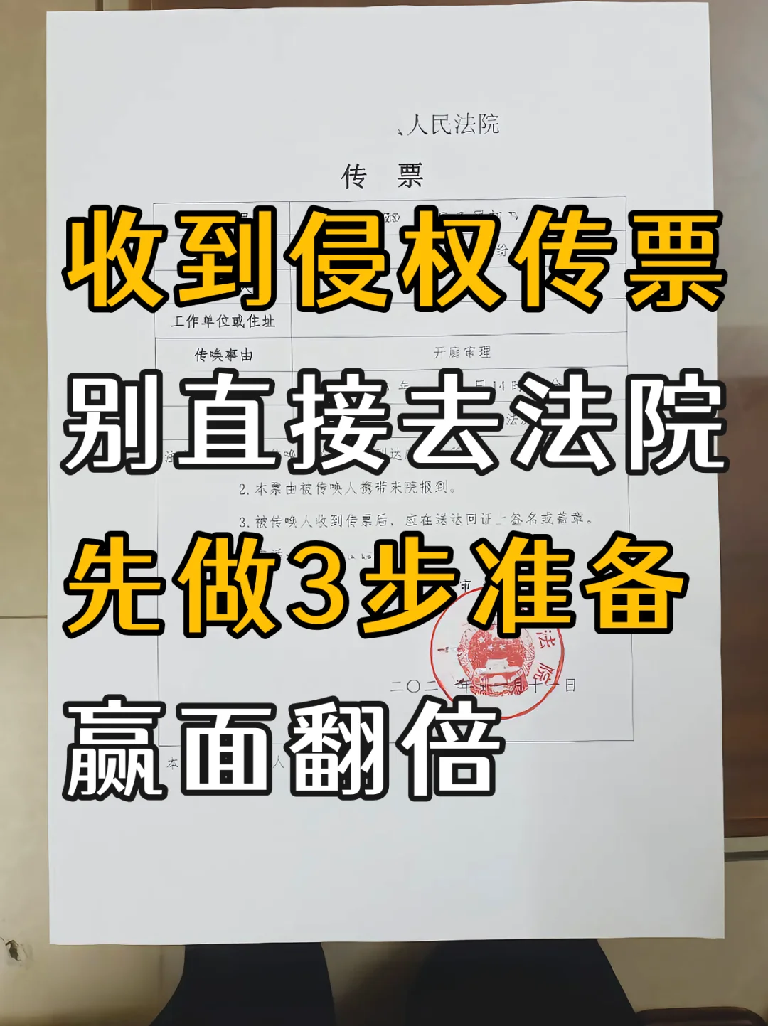 收到法院侵权传票别慌!盲目开庭易因证据不足多赔钱或败诉,先做 3 步准备,应诉更稳,不少人靠这避开高额赔偿!​ ​ 一、拆传票 + 理案情,搞懂 “告你什么、要赔多少”​ 细看传票 3 个关键信息:​ ① 原告身份(公司 / 个人,如品牌方、版权方);② 侵权行为(卖假货、用他人图文、商标侵权等);③ 诉求(赔偿金额、是否停止侵权)。​ [星R]关键:对照原告附的侵权证据(截图,判断是真侵权还是被误告(如原告认错店铺),提前理清可少走弯路。​ ​ 二、固定 “不侵权 / 减轻责任” 证据,别等开庭再找​ 这是应诉核心,重点收集 3 类证据:​ ① 不侵权证据:商标侵权找自身商标注册证,图片侵权找正版授权 / 原创证明(拍摄原图、版权证书);​ ② 减轻责任证据:确侵权的,存 “侵权时间短”(如卖 10 件下架)、“获利少”(利润几百元)的凭证(销售记录、利润表);​ ③ 原告过错证据:如原告明知有授权仍起诉、索赔远超损失(获利 500 元却要赔 5 万),保留沟通记录。​ [星R]提醒:证据要原件 / 清晰复印件,聊天记录截全(含头像、时间),别存片段。​ ​ 三、评估 “和解还是应诉”,别硬扛也别乱妥协​ 别拒沟通或轻易妥协,先做 2 个评估:​ ① 确侵权且证据足,可连·系原告和解(下架商品 + 赔合理金额),撤诉比败诉更划算;​ ② 被误告或原告证据不足,可应诉,找律师分析:如原告无直接侵权证据,可主张 “证据不足,驳回诉求”。​ [星R]律师作用:复杂情况(专利侵权、索赔超 10 万)找律师,帮审证据有效性、算合理赔偿、谈和解,比自己应对靠谱。​ ​ ✅ 收到传票别犯这 2 个错​ 别拒收传票:拒收视为 “放弃答辩权”,法院可能缺席判决败诉;​ 别拖延:传票有 15 天左右答辩期,需在期限内交证据和答辩状,超期可能不被采纳。​ ​ 收到侵权传票不可怕,怕盲目应对!做好拆案情、固证据、评方案 3 步,和解或应诉都有底气。正纠结准备方向,可推 → 荐专业律师帮你梳理!​ 侵权 侵权纠纷 侵权纠纷律师 侵权律师 律师咨询 侵犯著作权 拿起法律武器 版权 律师推荐 (案例来源:2025 年某法院侵权纠纷判决书)​