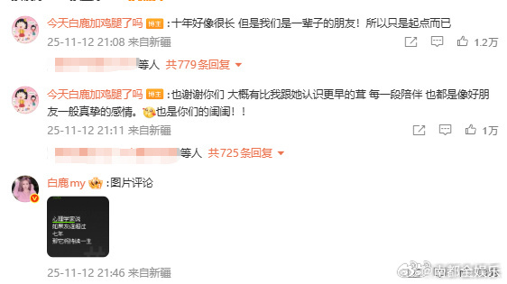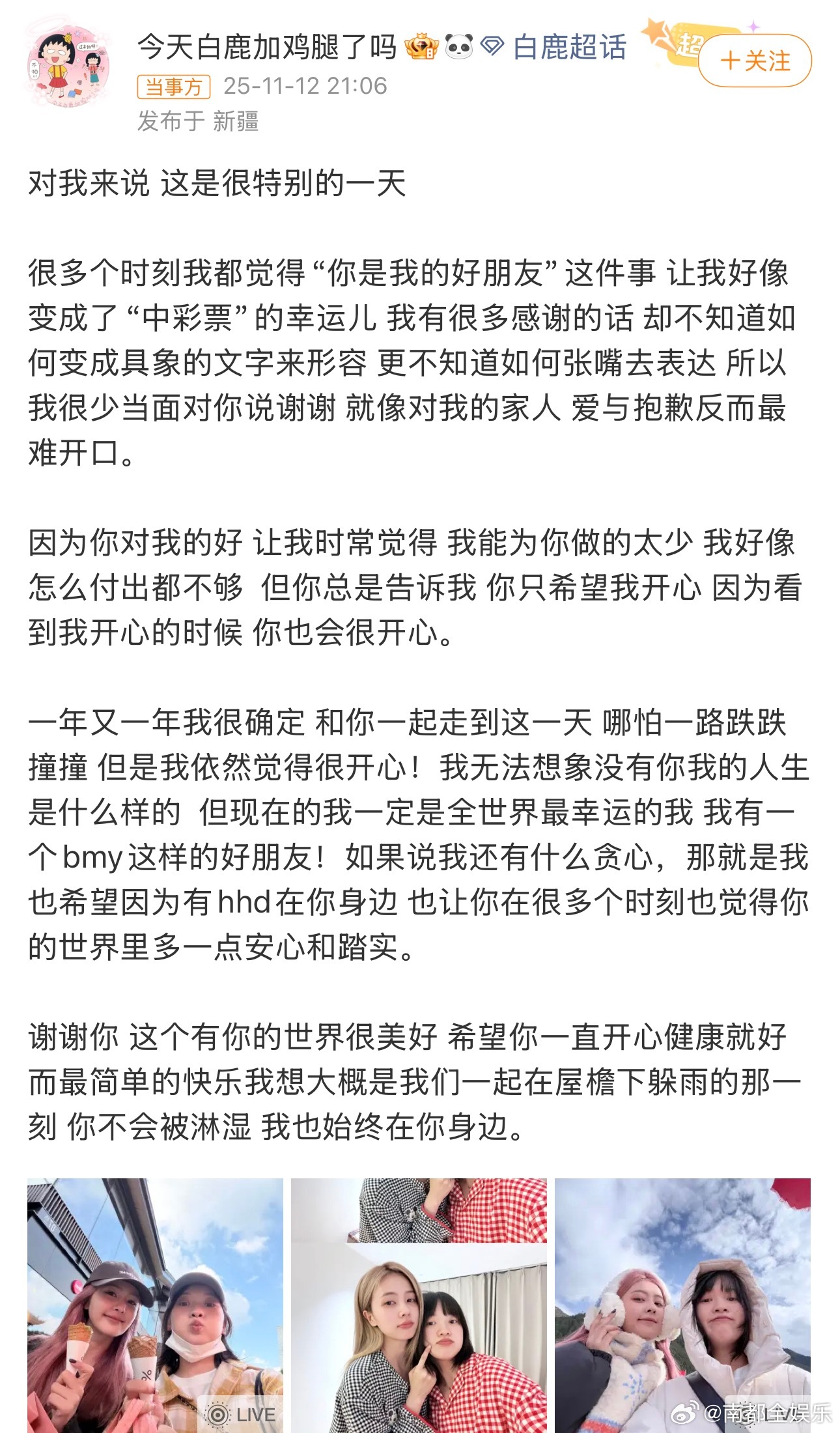 12日晚, 晒与助理呵呵合照,并配文庆祝友谊十周年。随后,呵呵也发长文感谢白鹿,表示跟白鹿做好朋友如同中彩票一样,“我无法想象没有你我的人生是什么样的”。白鹿评论:“心理学家说如果友谊超过七年,那它将持续一生。”陪着白鹿一路从小演员到大明星,呵呵和白鹿就是最好的家人!