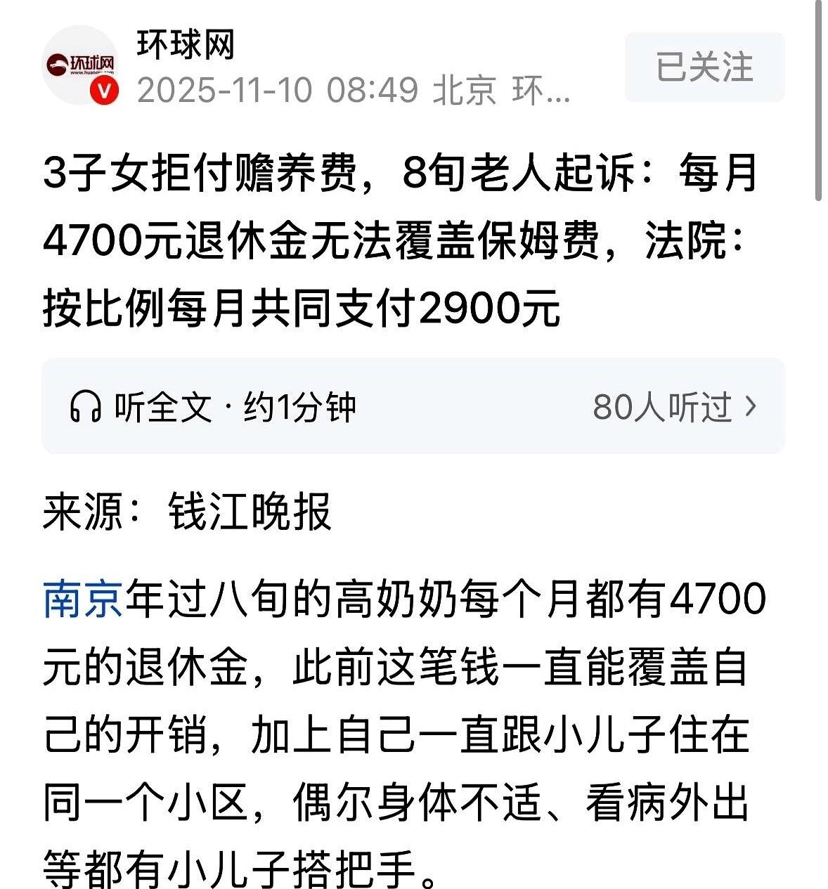 八十岁的老太太,最后是被亲生子女逼上法庭的。 就因为她病了,想请个保姆照顾自己,三个子女,没一个肯出钱。 理由是:您退休金4700呢,够花了,请保姆是“不必要的开支”。 我每次看到这种新闻,都觉得心口堵得慌。 什么叫“不必要的开支”? 老太太一个人在家,忘了关煤气,摔在卫生间,这就不危险了? 之前小儿子天天跑来照顾,现在被工作拴住了,分身乏术,这不叫现实? 4700,听着是不少。 可账不是这么算的。 保姆3500,吃药看病1200,这加起来就4700了,一分不剩。 老太太连买点日常用品,可能都得动自己的老本。 这就是他们嘴里的“够花”。 说白了,子女们不是算不清这笔账。 他们是觉得,老妈的“晚年生活质量”,不值得他们花钱。 他们觉得,只要妈还活着,喘着气,没大事,就算尽孝了。至于她活得舒不舒心,体不体面,那不重要。 请保姆,是帮子女减负啊,朋友们。 是把你们从“万一老妈出事怎么办”的每日焦虑里解放出来。 这笔钱,花的不是“奢侈”,是“安心”。 可有的人就是不懂。 或者说,揣着明白装糊涂。 他们宁愿让老母亲去法院告他们,让法官来给他们普及《民法典》,把脸丢尽,也不愿掏这几百块钱。 最后法院判了,一人800。 真讽刺,早干嘛去了?非要法律抽一鞭子,才知道往前走一步。 有时候想想,养孩子,图的到底是什么呢? 可能图的就是,在你最需要搭把手的时候,他给你讲一堆他自己的难处吧。