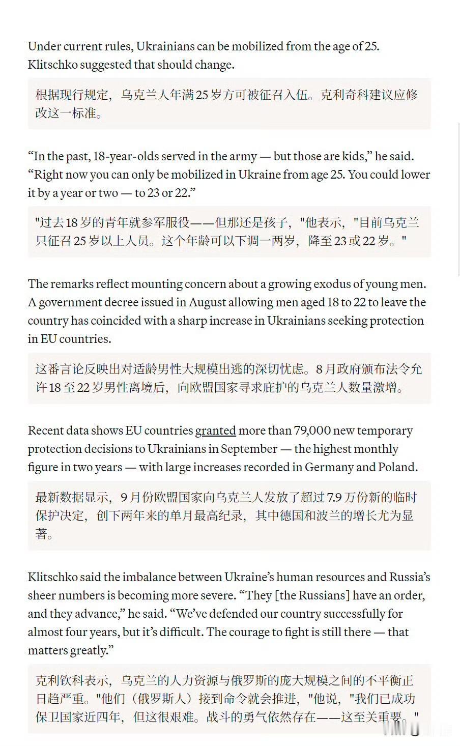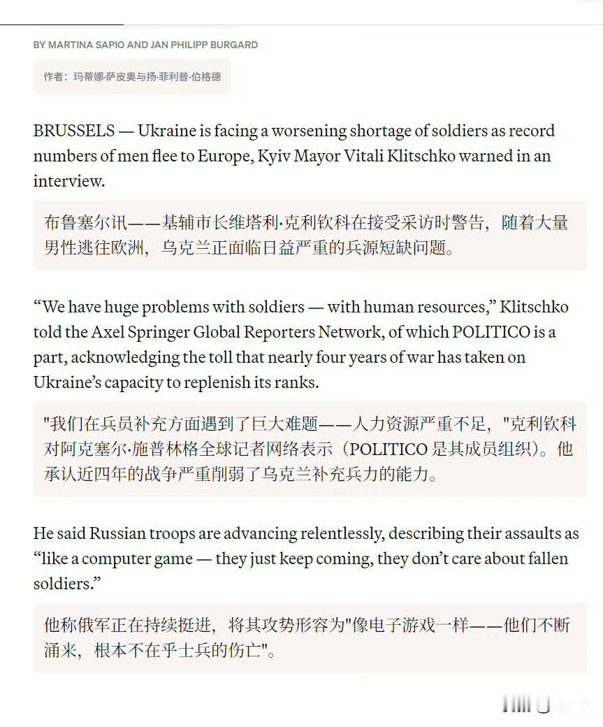 基辅市长克里琴科称:“随着大量男性逃往欧洲,乌克兰正面临日益严重的兵源短缺问题。