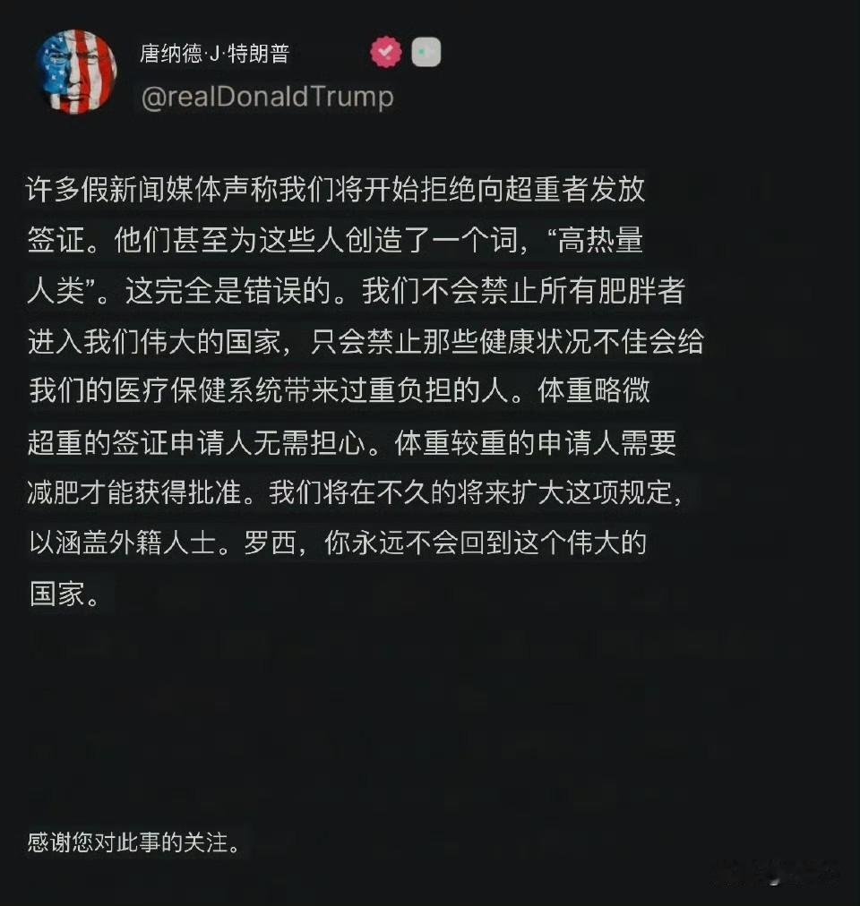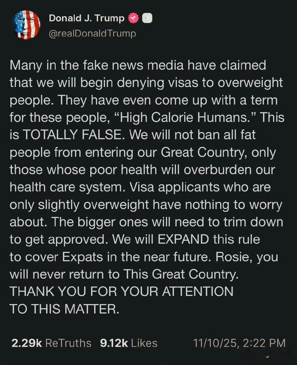 特朗普政府正指示签证官员拒绝肥胖人士和有高昂医疗问题的人入境,理由是这些人可能会给美国医疗体系和纳税人带来负担。有一出是一出的太抽象了,特朗普你什么时候驱逐派大星啊?