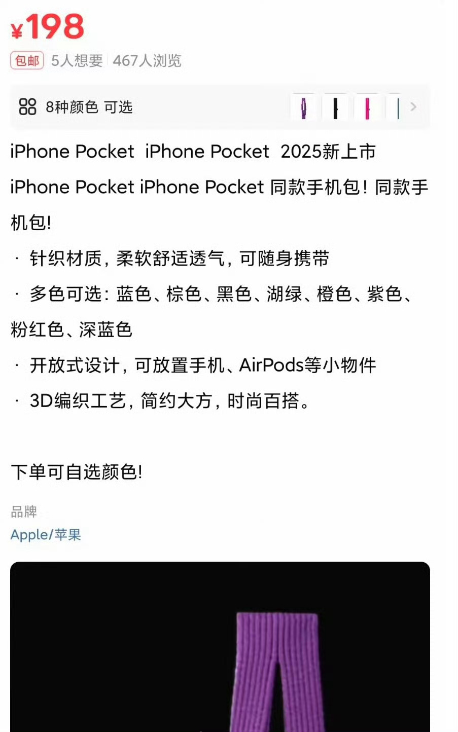 近日,苹果与三宅一生推出的新品iPhone Pocket备受关注,其设计灵感源于一块布,售价1299元起,将于11月14日发售。目前,电商平台上已有不少商家上架模仿iPhone Pocket的同款产品,标价在189元至200元不等。有售卖链接显示,iPhone Pocket同款手机包采用针织材质,3D编织工艺,可放置手机、AirPods等小物件,多色可选。