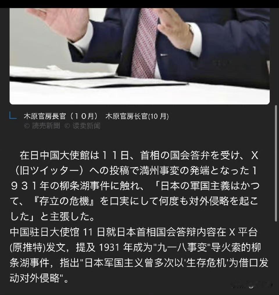 读卖新闻报道,日本官房长官木原在 11 日的记者会上透露,针对高市早苗在国会答辩中的言论,已就“答辩主旨及我国立场”向中方作出说明。他强调“日本政府对台立场未有改变”,并表示将继续致力于推动日中“战略互惠关系”。不仅日本右翼期待的一个没有,而且晚了。