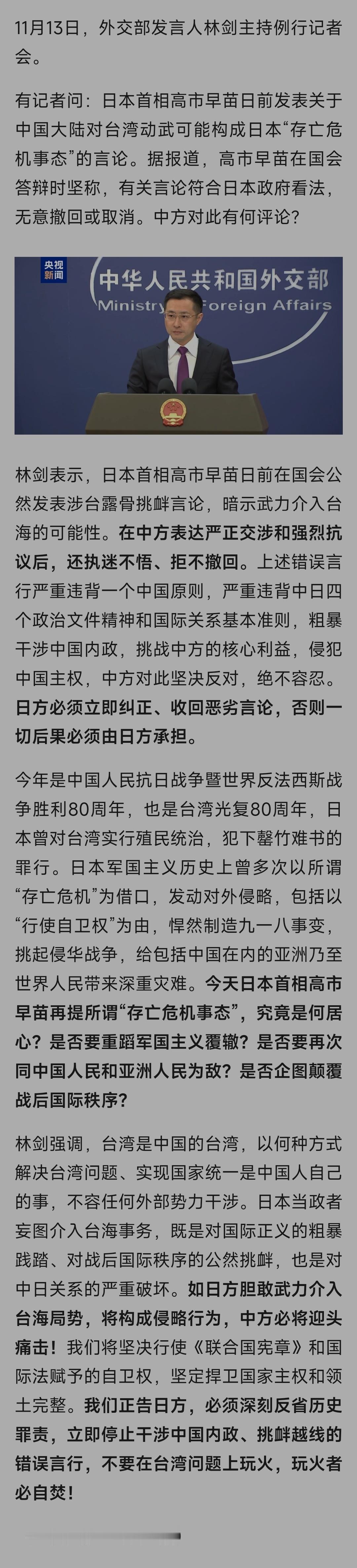 近日,日本首相高市早苗在国会公然发表涉台露骨挑衅言论,暗示武力介入台海可能性,在中方严正交涉和强烈抗议后仍拒不撤回,这一行径严重违背一个中国原则,粗暴干涉中国内政,挑战中方核心利益,必须予以严厉批判。热点解读 历史上,日本曾对台湾实行殖民统治,犯下罄竹难书的罪行。军国主义时期,日本以所谓“存亡危机”为借口,悍然制造九一八事变,挑起侵华战争,给包括中国在内的亚洲乃至世界人民带来深重灾难。如今高市早苗再提所谓“存亡危机事态”,其居心叵测。这不得不让人怀疑日本是否要重蹈军国主义覆辙,再次同中国人民和亚洲人民为敌,企图颠覆战后国际秩序。这种历史记忆的淡忘和歪曲,是对受害国人民感情的严重伤害,也是对历史正义的公然蔑视。 台湾是中国的台湾,这是基于历史、法律、文化和国际关系准则的事实。以何种方式解决台湾问题、实现国家统一,是中国人自己的事,不容任何外部势力干涉。日本当政者妄图介入台海事务,是对国际正义的粗暴践踏、对战后国际秩序的公然挑衅,更是对中日关系的严重破坏。中日两国是一衣带水的邻邦,本应和平共处、共同发展。但日本一些政客却为了一己私利,在台湾问题上不断挑衅,这种行为不仅损害了中日两国的利益,也破坏了地区的和平与稳定。 中方已经明确表态,如日方胆敢武力介入台海局势,将构成侵略行为,中方必将迎头痛击,坚定捍卫国家主权和领土完整。日本应该深刻反省历史罪责,立即停止干涉中国内政、挑衅越线的错误言行。在台湾问题上玩火,无疑是自掘坟墓,玩火者必自焚。日本应认清形势,不要在错误的道路上越走越远,否则必将承担一切后果。全网热点共创计划 外交部四问高市早苗