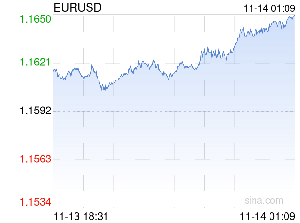 新浪外汇消息2025年11月14日,截至01时09分,外汇市场上欧元兑美元汇率突破1欧元兑换1.1650美元。涨幅为0.5003%