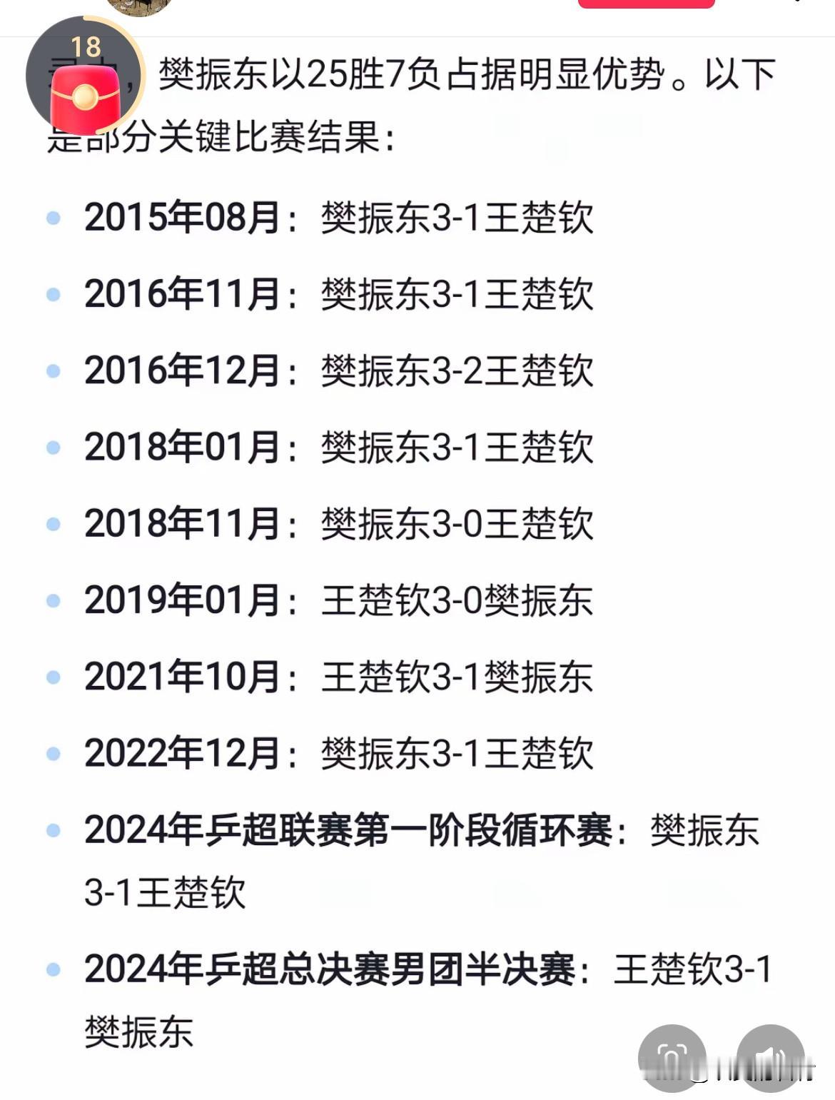 王楚钦和樊振东谁能晋级决赛? 我觉得樊振东晋级决赛概率大一些。 原因有两个 第一,樊振东王楚钦交手32次。樊振东25胜7负。 2024年樊振东王楚钦交手两次,一胜一负。 王楚钦对阵樊振东,从交手记录上看樊振东胜率大。 第二,全运会乒乓球比赛中樊振东状态更好。看看王楚钦樊振东的晋级之路。 男单1/16决赛 王楚钦4:1魏世皓 樊振东4:0周雨 男单1/8决赛 樊振东4:1薛飞 王楚钦4:3黄镇廷 男单1/4决赛 樊振东4:0孙正 王楚钦4:2林高远 王楚钦的三场比赛感觉他很累。打黄镇廷,打林高远都挺艰难。大头状态好的时候打黄镇廷打林高远都能4:0获胜。 实际上樊振东从德国赶回中国参加全运会,应该樊振东更累一些。当然王楚钦参加的商业活动多,也很累。 他们俩都很优秀,谁赢都好。 所以半决赛王楚钦对阵樊振东 我感觉樊振东晋级决赛概率大。 你们认为王楚钦樊振东谁能晋级决赛?