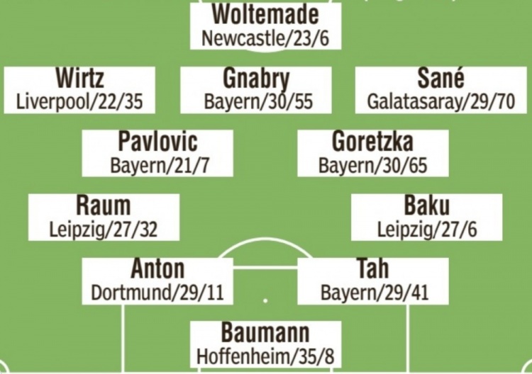 中场:帕夫洛维奇(拜仁)、格雷茨卡(拜仁)、维尔茨(利物浦)、格纳布里(拜仁)、萨内(加拉塔萨雷)
