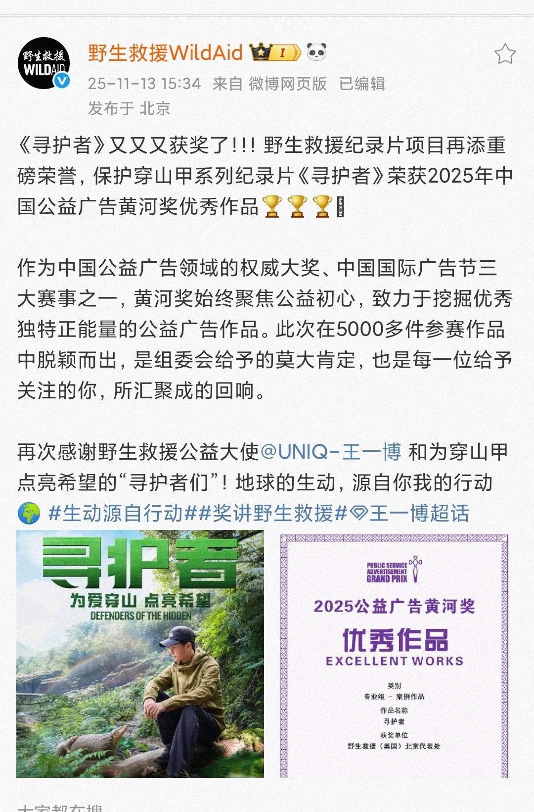 王一博主演的保护穿山甲系列公益纪录片《寻护者》又又又获奖了!!!再添重磅荣誉!纪录片《寻护者》荣获2025年中国公益广告黄河奖优秀作品🏆🏆🏆 ps:中国公益广告黄河奖是中国公益广告领域的权威大奖、中国国际广告节三大赛事之一。 王一博的每一部作品,不管是影视剧还是纪录片还是综艺,都是“精品”的保障[赞]。 王一博