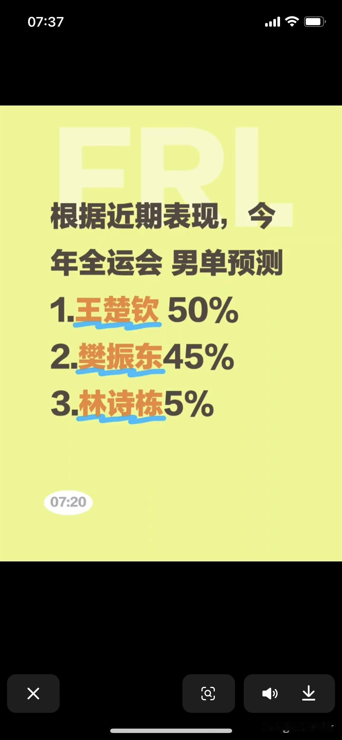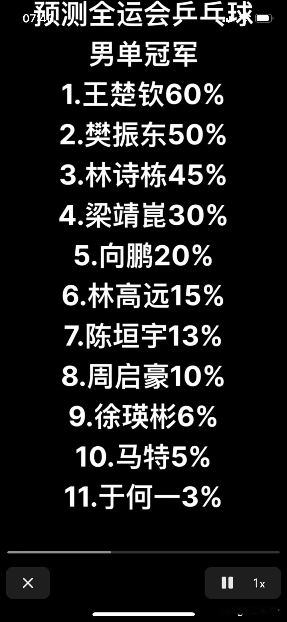 我希望林诗栋全运会男单夺冠 网友预测全运会乒乓球男单夺冠的概率 1、王楚钦50% 2、樊振东45% 3、林诗栋5% 看了有点难过。林诗栋夺冠概率太低了。我希望林诗栋夺冠🏆 这只是预测。 可以肯定的是,王楚钦樊振东晋级决赛的概率都没有林诗栋晋级决赛的概率大。[捂脸][捂脸] 我希望小石头林诗栋全运会男单夺冠,虽然可能性不高。小石头无论是和樊振东还是和王楚钦对阵林诗栋都是输多赢少。只能说小石头林诗栋加油。夺冠更好。不夺冠就当学习了。 林诗栋加油!