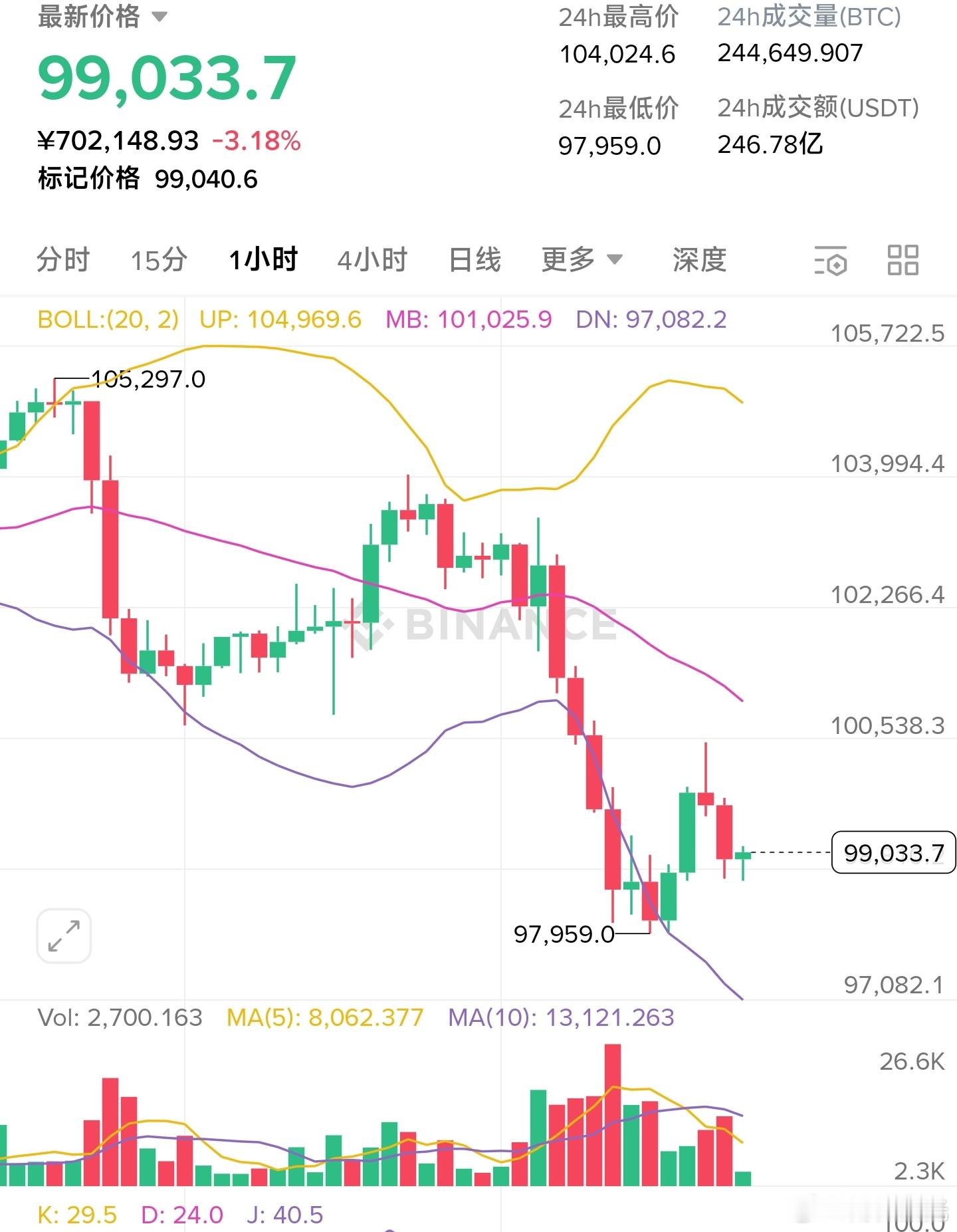 11.14早间大冰分析策略昨晚刚说完反弹做箜,结果直接破位,小碎步式迭至97959,从四小时线上看,磐面三大连阴后,在98000附近有一定的支撑,早间刚向上突破10万关口就被打下来,说明反弹动能不足,目前箜头还是主力。macd红柱逐渐放大,布林带下轨丝毫没有收手的信号,日内还是以高箜为主。回弹100800-100500区间箜,目标97000,破位看9660