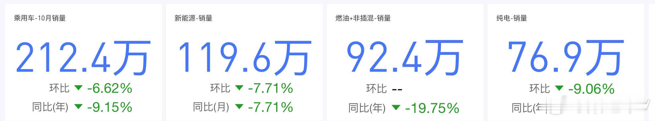 10月,国内乘用车销售212.4万辆,环比下滑6.6%,同比下滑9.2%,今年10月假期叠加中秋假期与去年比较多了一天,对新车销量有所影响。10月,纯电细分市场销售77万辆 ,同比增长13.5%,是全部细分市场中保持增长的市场。在纯电市场中,10万元以下市场销售32.6万辆,同比增长24%,份额为42%,与去年同期比较份额增加3个点,小型/微型车销量达到26万辆。这一市场是由国补、地补带动增长的市场。10月部分地区补贴暂停,从而带动这些地区新能源车抢购,带动了新车销量的增长。在纯电市场中,25万-40万价格区间市场,销量同比也保持增长,这一市场是由新车带动增长的细分市场市场,主要以中大型SUV/轿车为主。