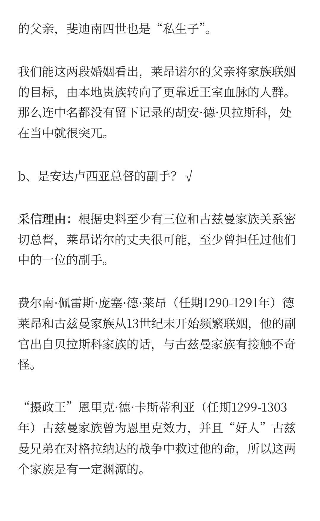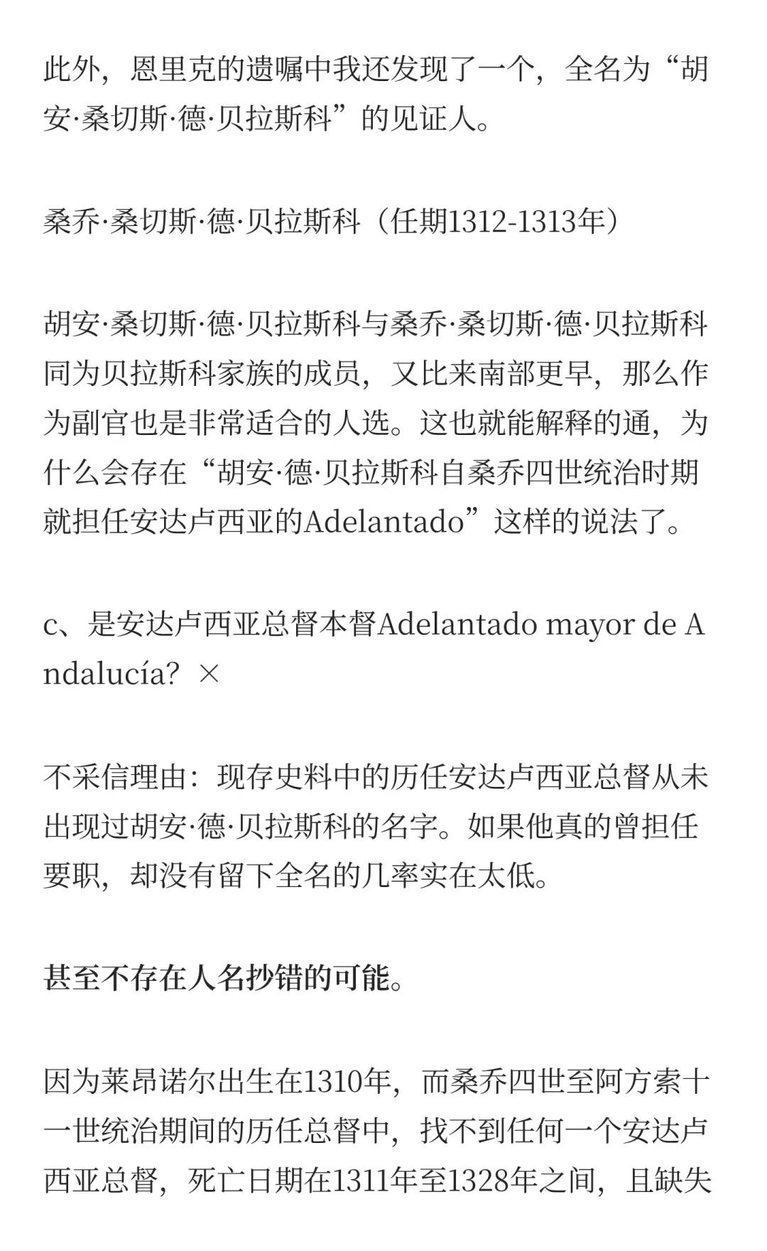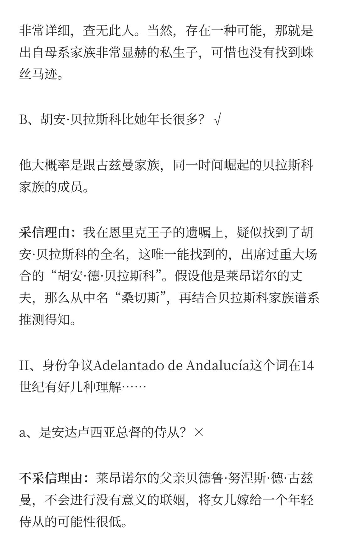 莱昂诺尔的第一任丈夫究竟是谁? 个人推测:“胡安·德·贝拉斯科”的全名是胡安·桑切斯·德·贝拉斯科。 大约出生于1263年前后。 是桑乔·桑切斯·德·贝拉斯科的同辈或父辈,也是费尔南·桑切斯·德·贝拉斯科的私生子或私生子兄弟。生前或许曾担任过一位或多位安达卢西亚总督的副手,如:费尔南·佩雷斯·庞塞·德·莱昂(任期1290-1291年)、“摄政王”恩里克·德·卡斯蒂利亚(任期1299-1303年)、桑乔·桑切斯·德·贝拉斯科(任期1312-1313年)等都有可能。 他大概率是跟古兹曼家族,相似时间崛起的桑切斯·德·贝拉斯科家族的成员,年龄比莱昂诺尔·德·古兹曼大很多,并且曾是恩里克·德·卡斯蒂利亚的遗嘱见证人之一。 西班牙历史 塞维利亚历史 贝拉斯科家族 德古兹曼家族