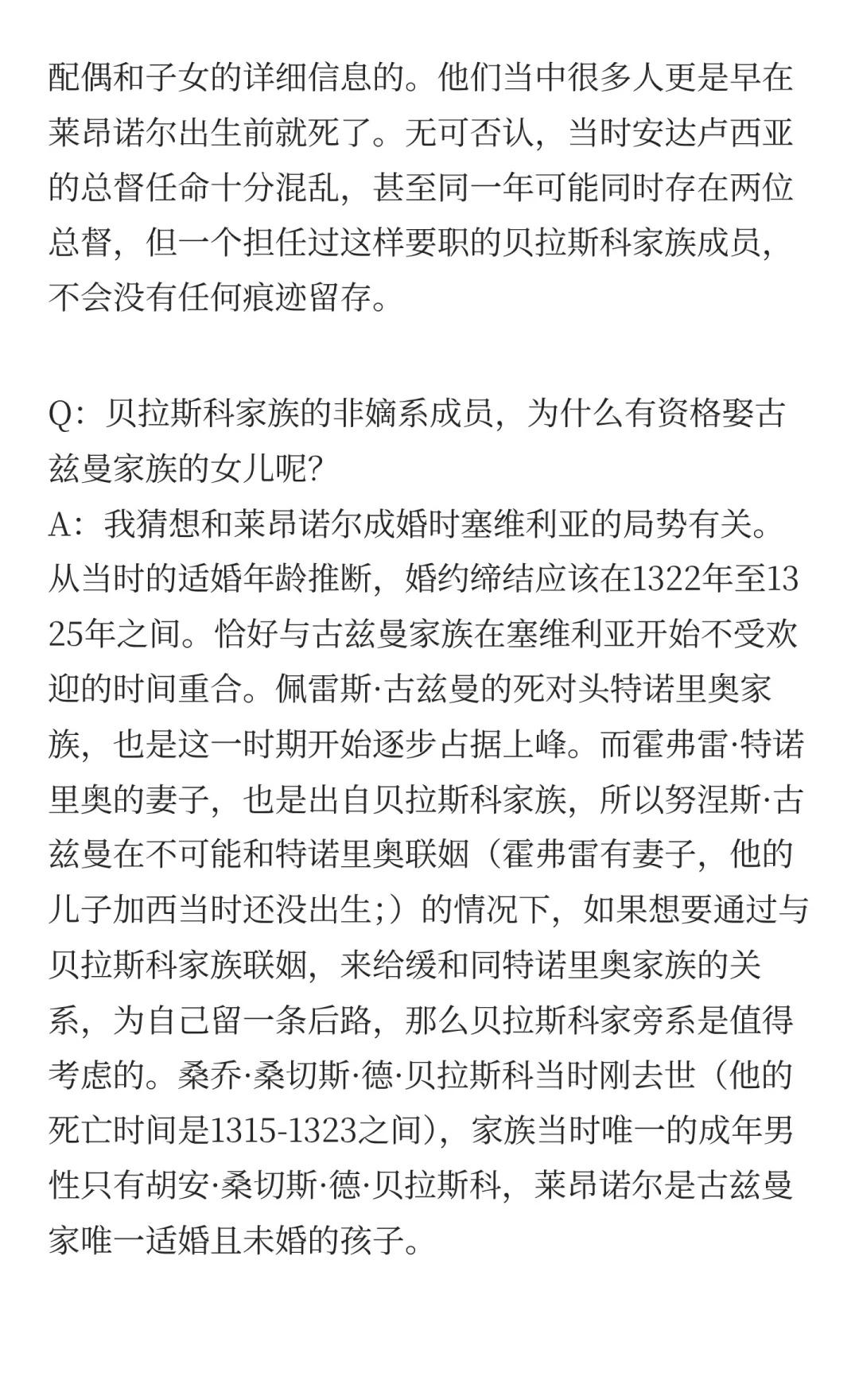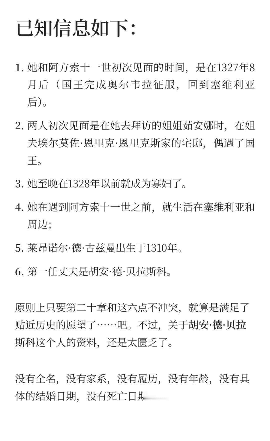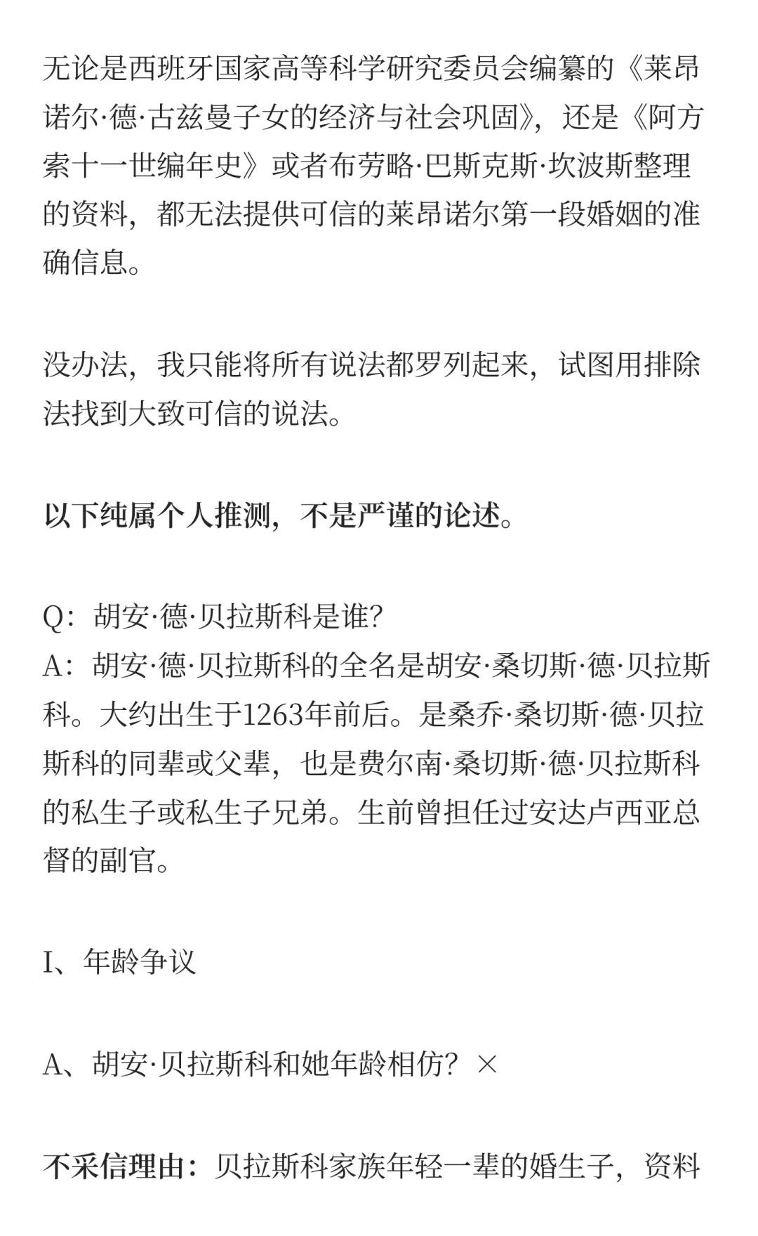 莱昂诺尔的第一任丈夫究竟是谁? 个人推测:“胡安·德·贝拉斯科”的全名是胡安·桑切斯·德·贝拉斯科。 大约出生于1263年前后。 是桑乔·桑切斯·德·贝拉斯科的同辈或父辈,也是费尔南·桑切斯·德·贝拉斯科的私生子或私生子兄弟。生前或许曾担任过一位或多位安达卢西亚总督的副手,如:费尔南·佩雷斯·庞塞·德·莱昂(任期1290-1291年)、“摄政王”恩里克·德·卡斯蒂利亚(任期1299-1303年)、桑乔·桑切斯·德·贝拉斯科(任期1312-1313年)等都有可能。 他大概率是跟古兹曼家族,相似时间崛起的桑切斯·德·贝拉斯科家族的成员,年龄比莱昂诺尔·德·古兹曼大很多,并且曾是恩里克·德·卡斯蒂利亚的遗嘱见证人之一。 西班牙历史 塞维利亚历史 贝拉斯科家族 德古兹曼家族