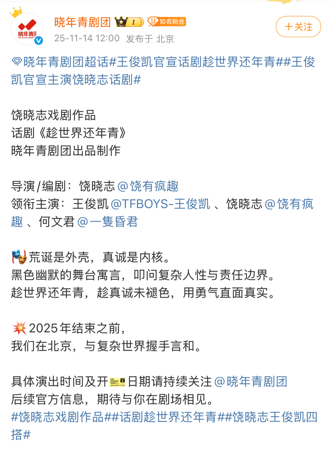 王俊凯要演话剧了《趁世界还年青》官宣。