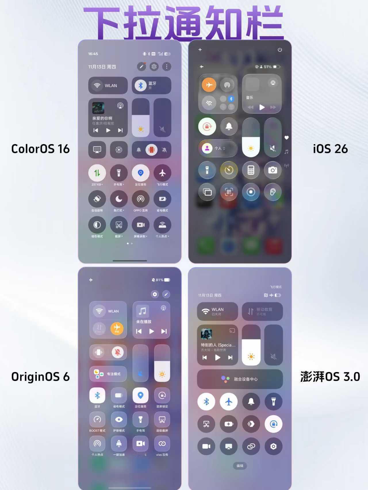 不看品牌,手机系统设计你pick哪款? 现在手机硬件都卷得差不多了,系统设计和体验反而成了选机关键! 整理了四款热门机型的系统,不看品牌只看设计,来聊聊谁更戳你~👇 📱iPhone 17 Pro Max(iOS 26):液态玻璃设计很创新,界面通透有质感,生态联动依旧能打,习惯苹果生态的很喜欢 📱vivo X300 Pro(OriginOS 6):还是那种“顺眼”的流畅感,层次很轻盈,图标也更克制,整体挺治愈 📱小米17 Pro Max(澎湃 OS 3):优化后流畅度在线,动画逻辑有改不少,超级岛体验加分,多设备互联挺方便 📱OPPO Find X9 Pro(ColorOS 16):口碑很好的一款,安卓流畅度排名TOP,光场设计细腻有质感,系统丝滑不卡顿,动画打断效果巨丝滑。 其实每款系统都有自己的亮点,🙋♀️不过安卓这边我更倾向ColorOS 16,设计和实用性都兼顾到了,加上 Find X9 Pro新机有7500mAh电池,续航安心很多,不太需要老盯着电量。 你们更pick谁家的系统设计? iPhone17ProMax 手机系统 ColorOS16 iOS26 OriginOS6 澎湃 OS3 选机攻略 系统设计 OPPOFindX9Pro