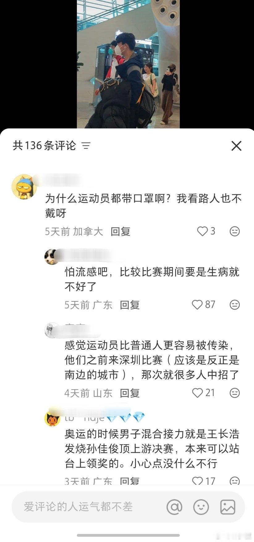 游泳运动员口罩好评。评论区还有问为啥戴口罩的。人与人之间的信息参差。流感正在爆发中,还有人没感觉的。